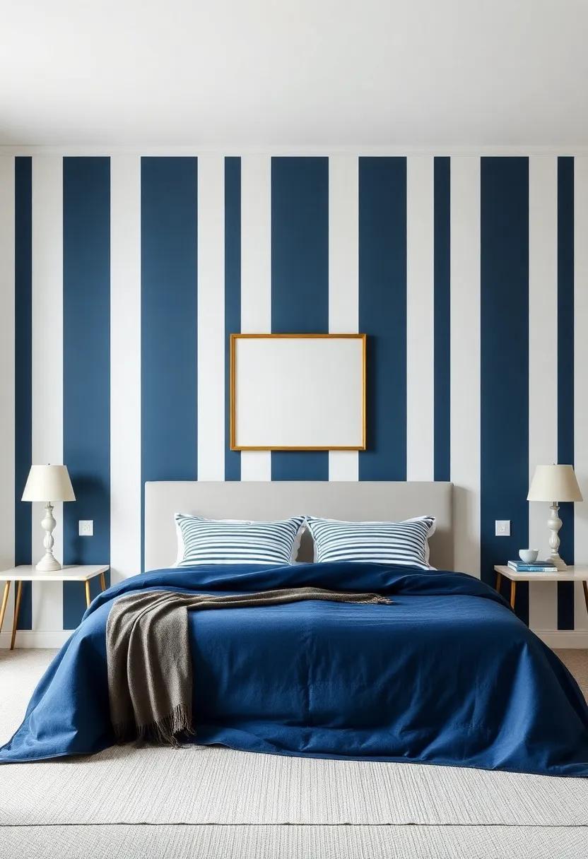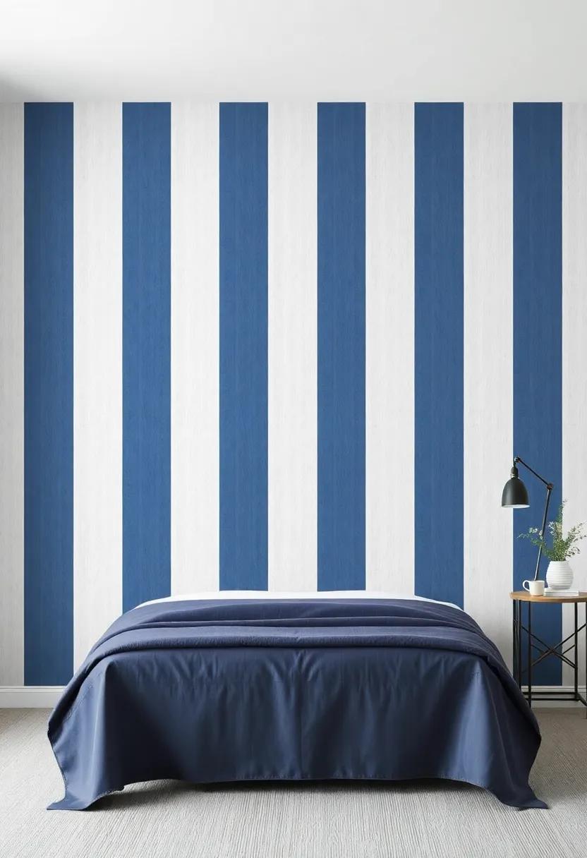 Transform your space with the serene charm of navy and white stripes,wich evoke a sense of tranquility and sophistication.These classic hues,reminiscent of coastal vibes and nautical themes,can seamlessly blend into any design aesthetic. The versatility of this color combination allows you to create a backdrop that not only harmonizes with various furnishings but also elevates your bedroom’s overall atmosphere. Emphasize the elegance further by opting for stripes of different widths, which can create visual interest and depth.