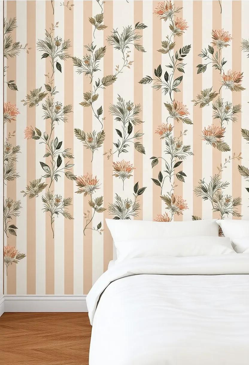 Mix and Match Patterns: Combine striped wallpaper with botanical prints to create a dynamic visual experience while maintaining balance through color coordination