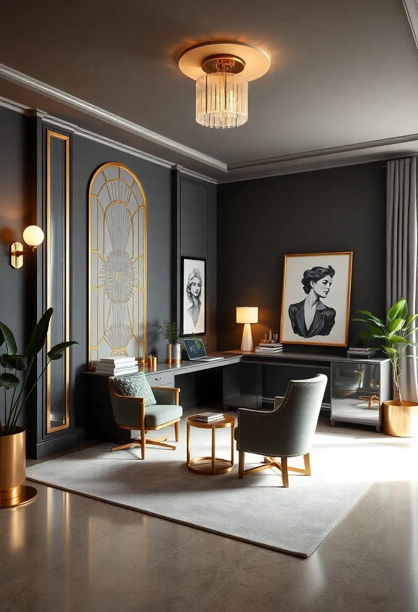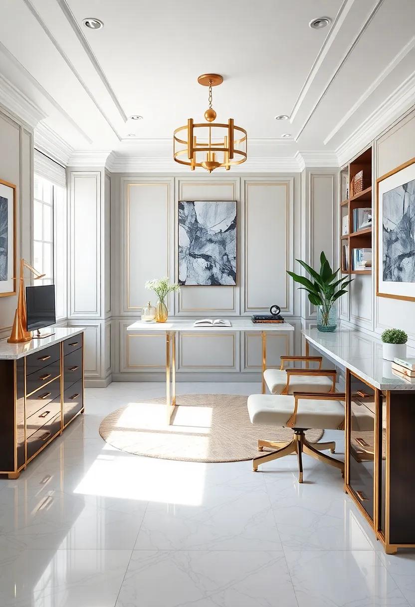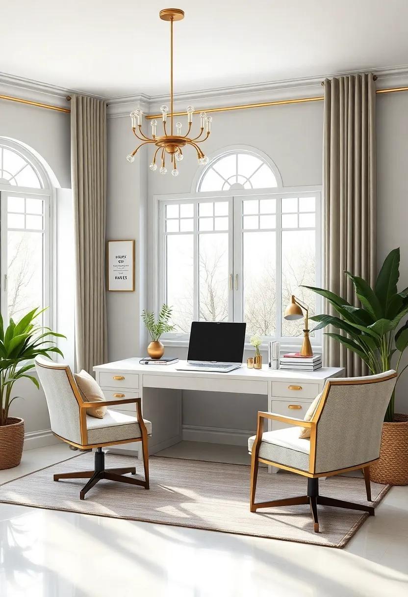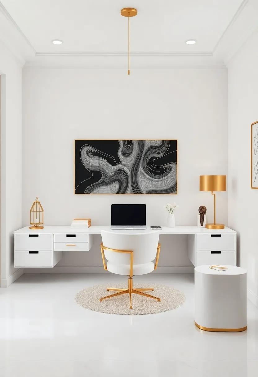 To further elevate this design, the addition of luxurious textiles—think deep, rich velvets contrasted against sleek leather—offers both comfort and style.A well-placed statement rug equipped with Art Deco motifs can anchor the space, making it feel cohesive and thoughtfully designed.Tables, adorned with gold accents, provide practical surfaces without compromising on elegance, making them the perfect settings for both work and creativity. Let’s not overlook the charm of carefully selected greenery; potted plants in chic pots can introduce a sense of life, balancing the bold metallics and muted whites beautifully.