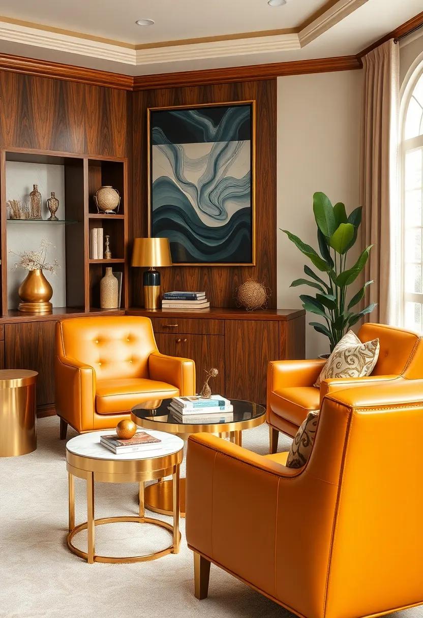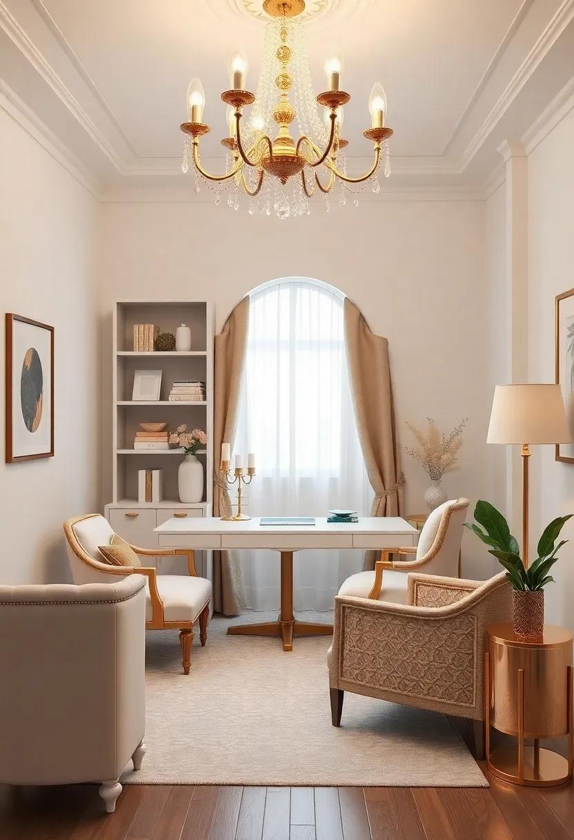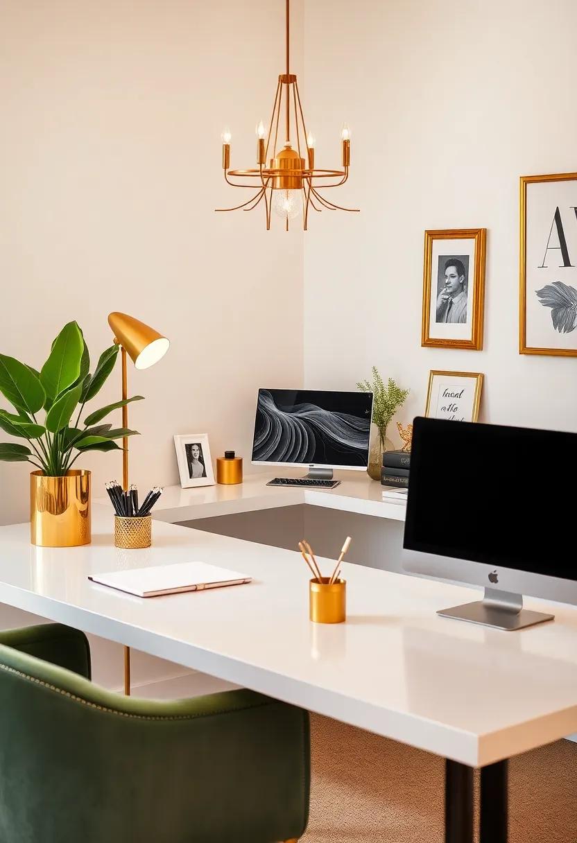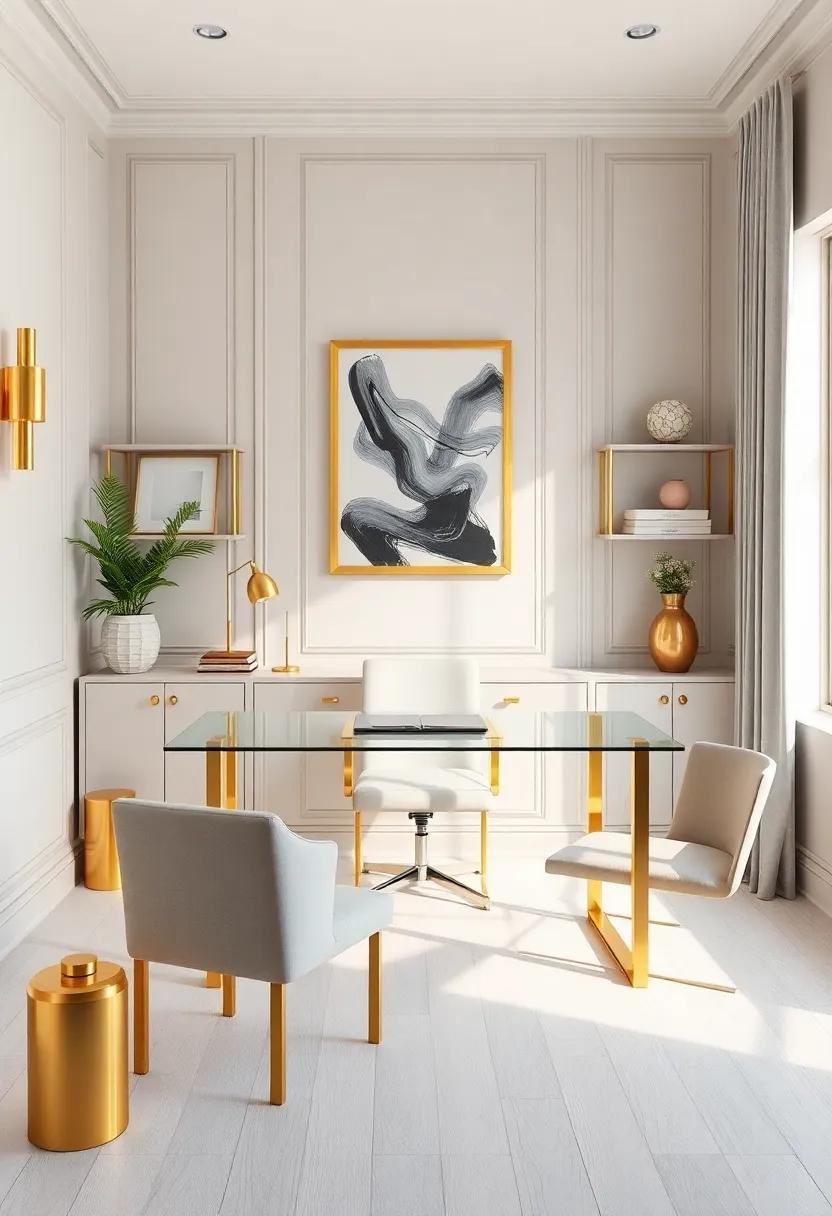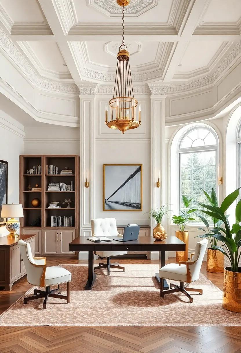To further elevate this design, the addition of luxurious textiles—think deep, rich velvets contrasted against sleek leather—offers both comfort and style.A well-placed statement rug equipped with Art Deco motifs can anchor the space, making it feel cohesive and thoughtfully designed.Tables, adorned with gold accents, provide practical surfaces without compromising on elegance, making them the perfect settings for both work and creativity. Let’s not overlook the charm of carefully selected greenery; potted plants in chic pots can introduce a sense of life, balancing the bold metallics and muted whites beautifully.