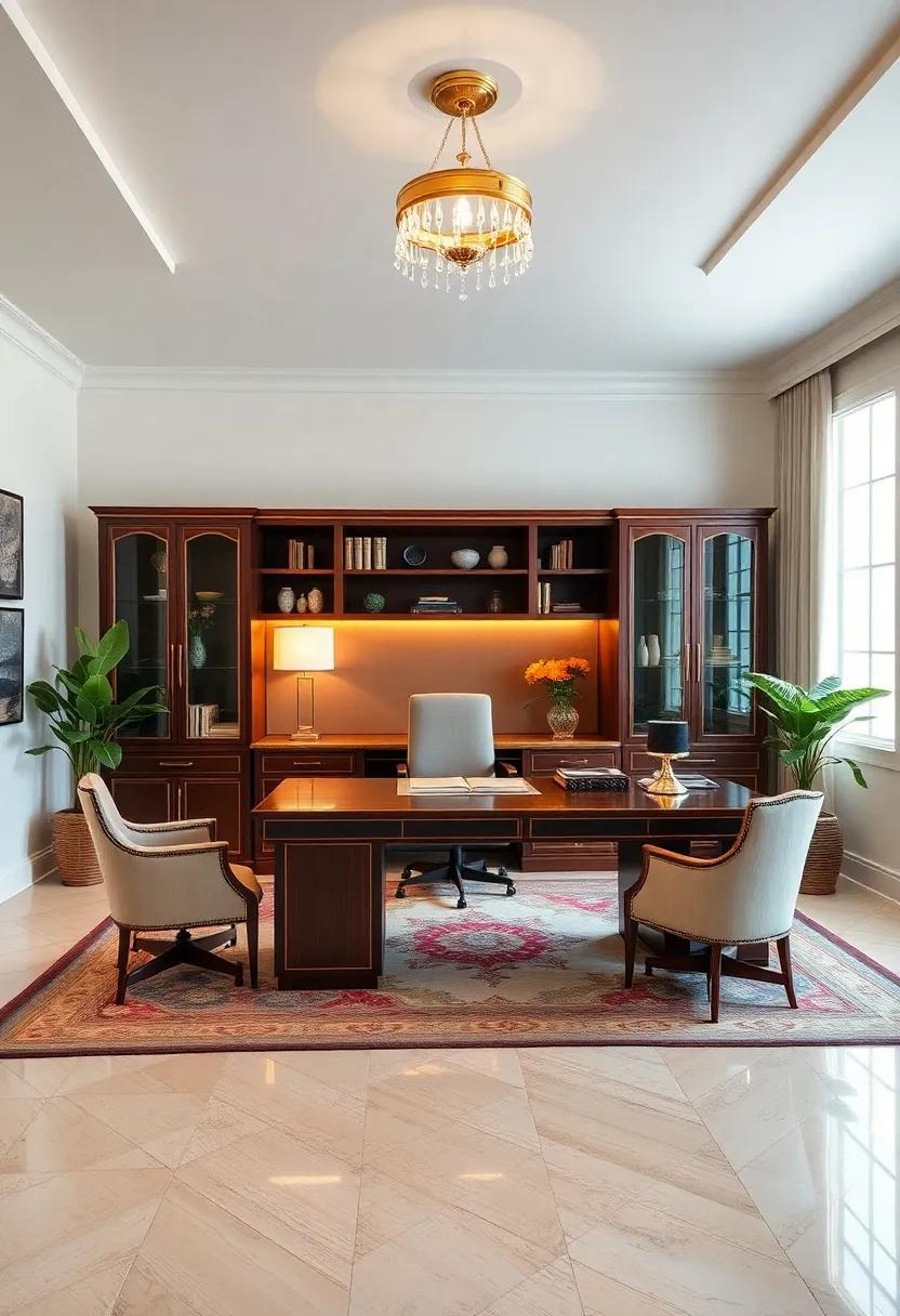 Imagine a workspace where elegance dances with functionality, transforming the mundane into the majestic. Art deco-inspired furniture steals the spotlight, featuring rich textures and intricate patterns that evoke a sense of nostalgia while remaining utterly contemporary. Picture a sleek desk with geometric lines and a glossy finish, paired with artfully crafted chairs that boast luxurious gold detailing—ideal for both comfort and style. Each piece harmonizes beautifully, creating a cohesive look that invites productivity without sacrificing aesthetic value.