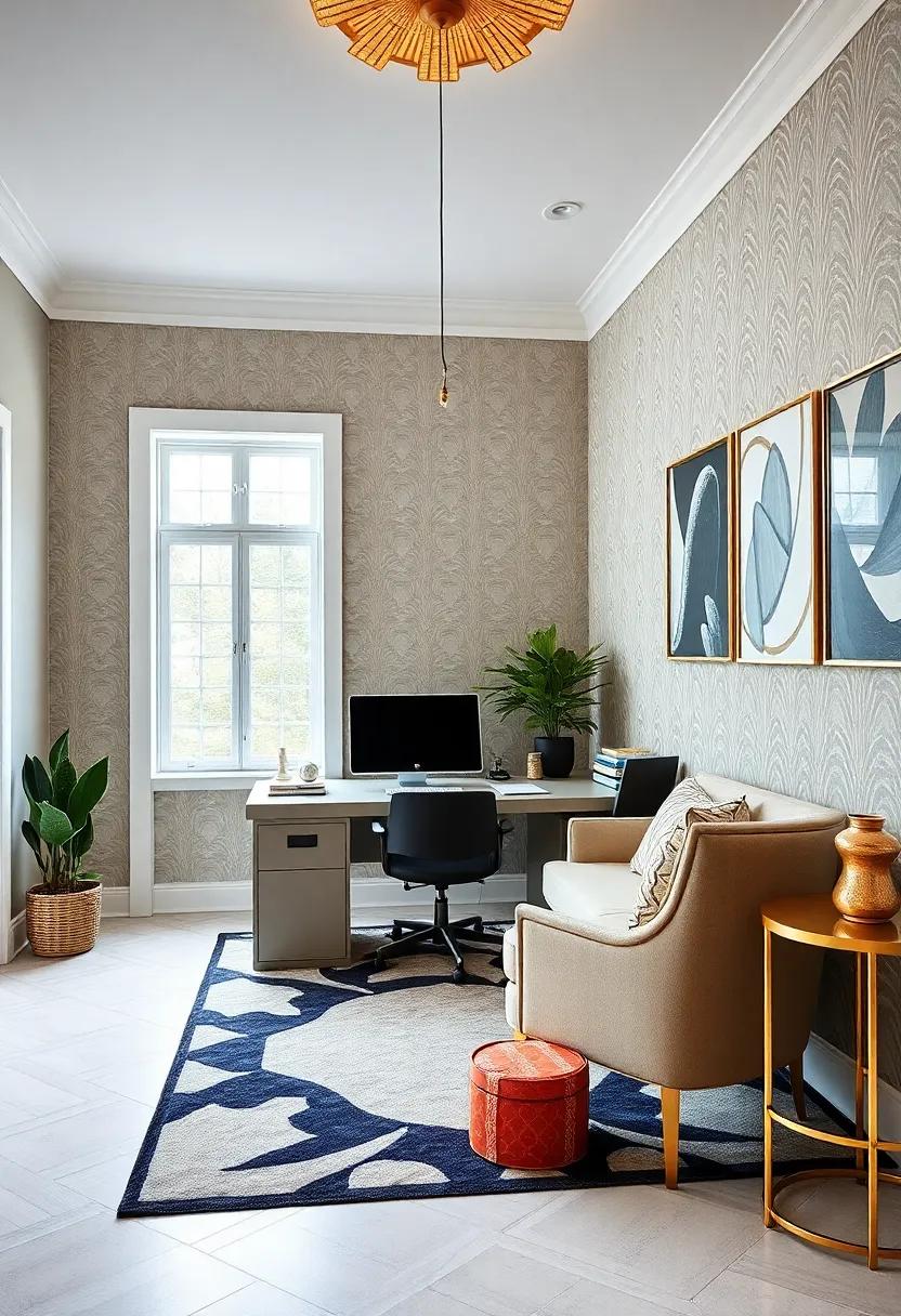 Step into an artistic wonderland by embracing a vibrant office design that harmonizes geometric patterns and stunning colors. Picture walls adorned with bold wallpapers featuring intricate shapes that catch the eye, creating a backdrop that fuels creativity. Pair these captivating patterns with a palette of deep jewel tones—think emerald greens, sapphire blues, and ruby reds. Accent those rich colors with striking gold details, like a gilded desk lamp or elegant picture frames, to bring an undeniable flair to your workspace.