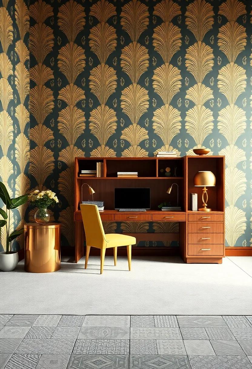 Step into a vintage-inspired office that boasts a stunning art deco wallpaper adorned with gold motifs, instantly transforming the space into a glamorous retreat for creativity