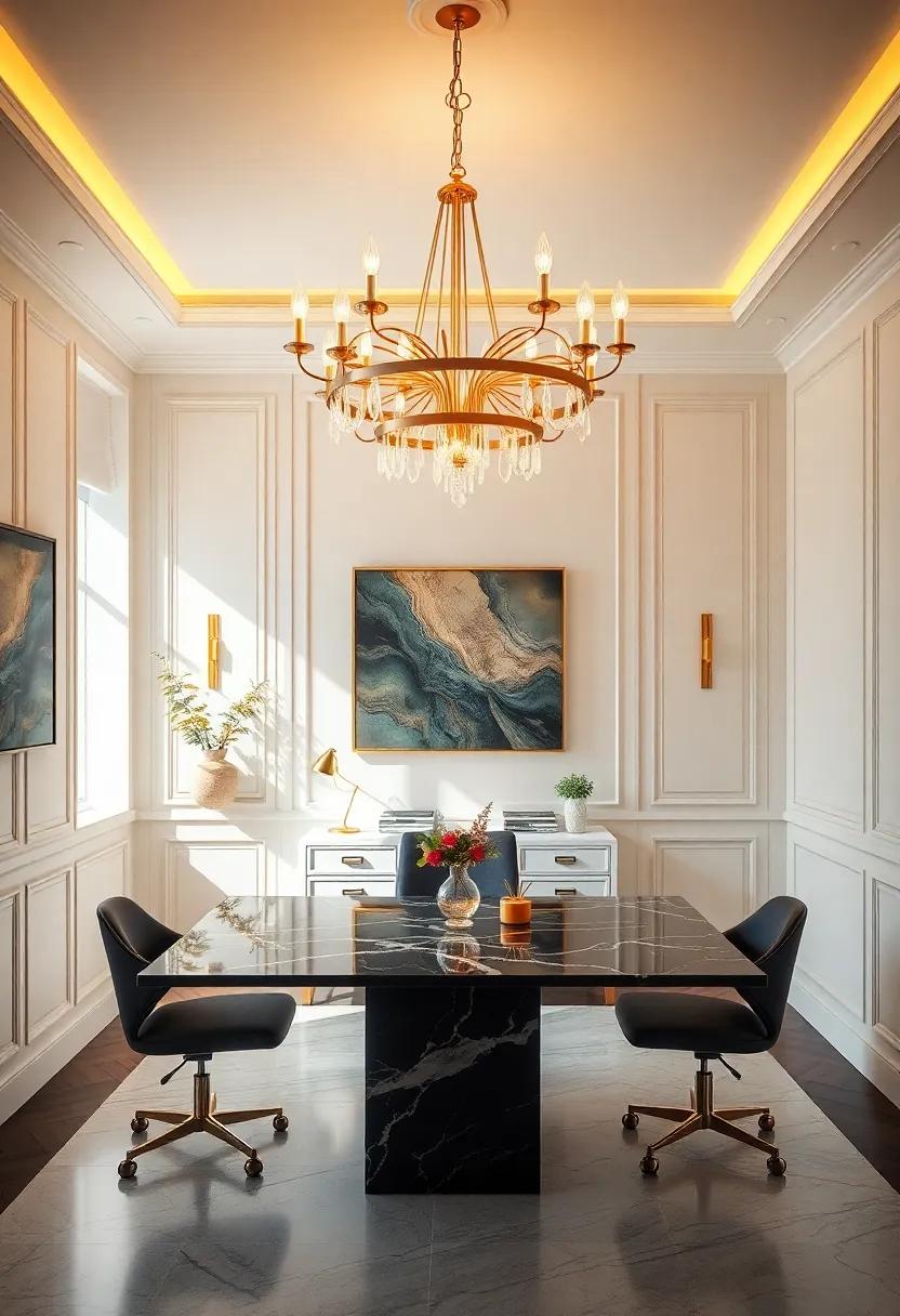 Explore a stunning workspace featuring a geometric gold chandelier that bathes the room in warm light, pairing beautifully with a sleek, black marble desk for a touch of modern elegance