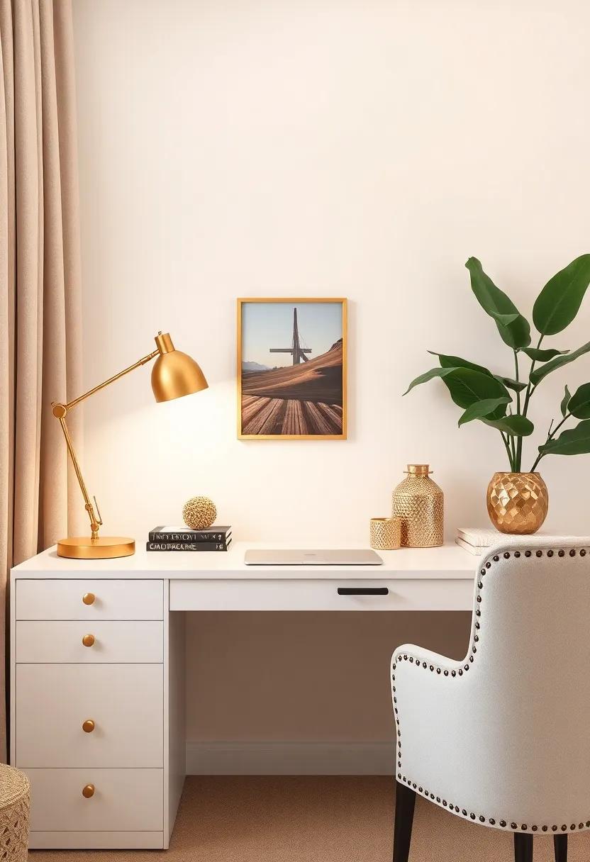 Unwind in a cozy workspace that incorporates a gold-accented desk lamp and ornamental accessories among a backdrop of soft, neutral tones, ensuring calm and creativity coalesce
