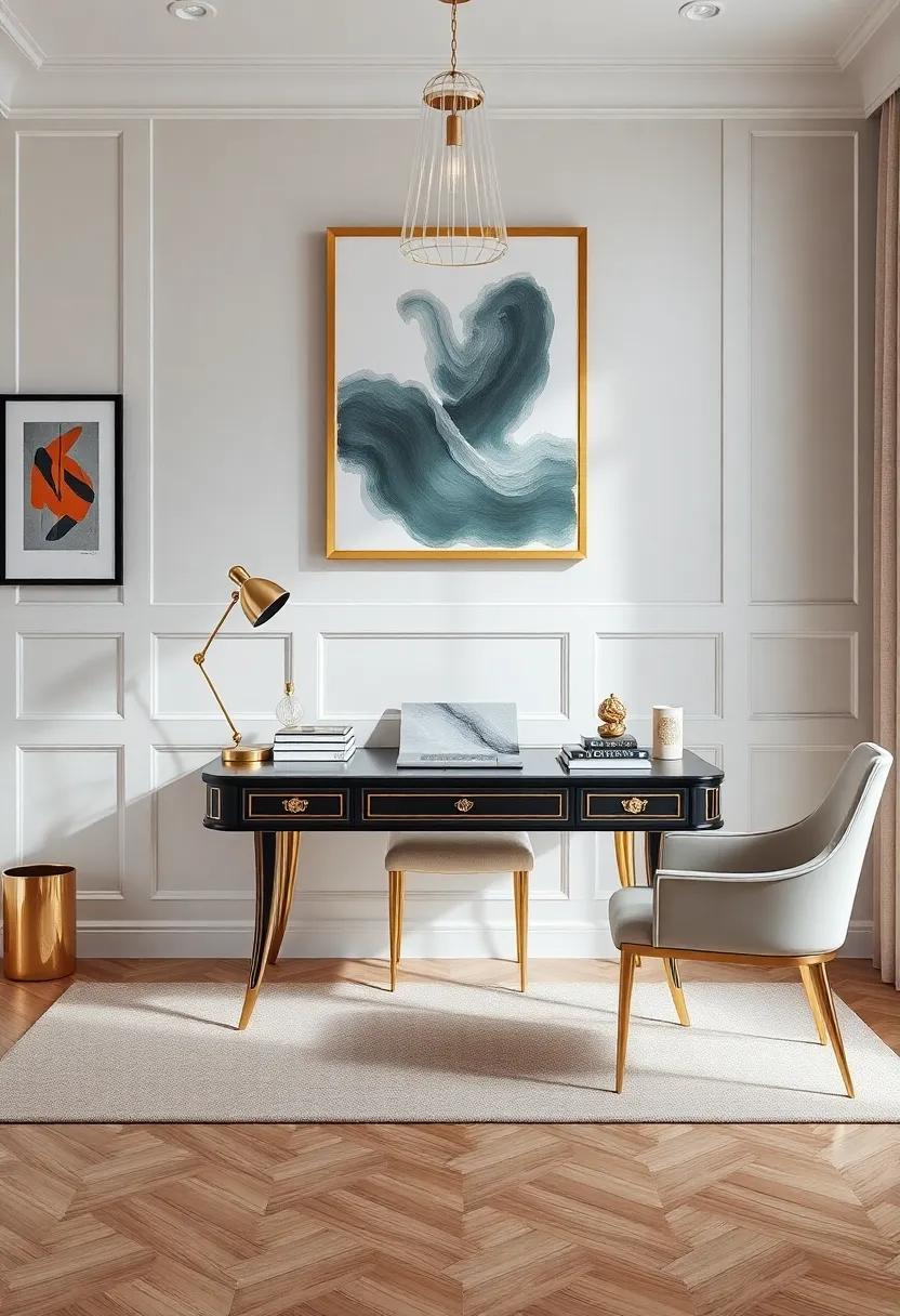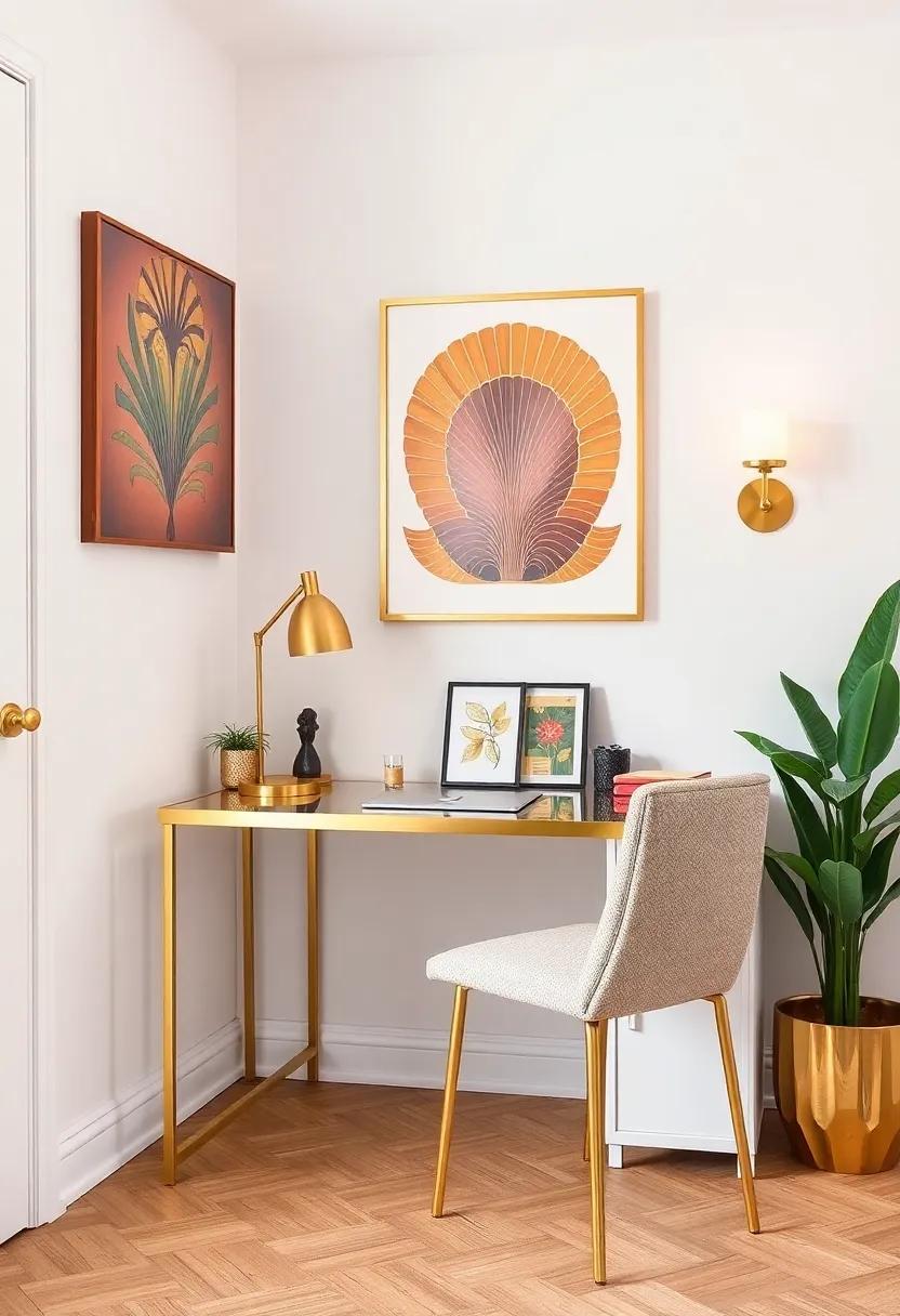 This chic office setup encourages productivity while embracing a distinct style. The gold accents catch the light, elevating the overall aesthetic, while carefully chosen art pieces envelop the space in inspiration. Consider these elements that contribute to the elegance of such a compact area:
