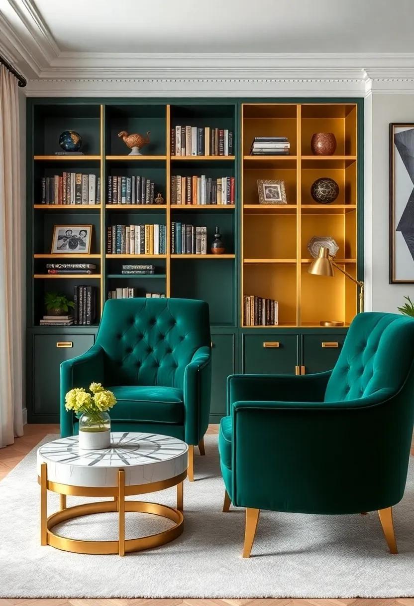 discover a chic office design where plush velvet chairs in deep emerald green contrast against a striking gold-accented bookshelf, elevating the ambiance with artistic flair