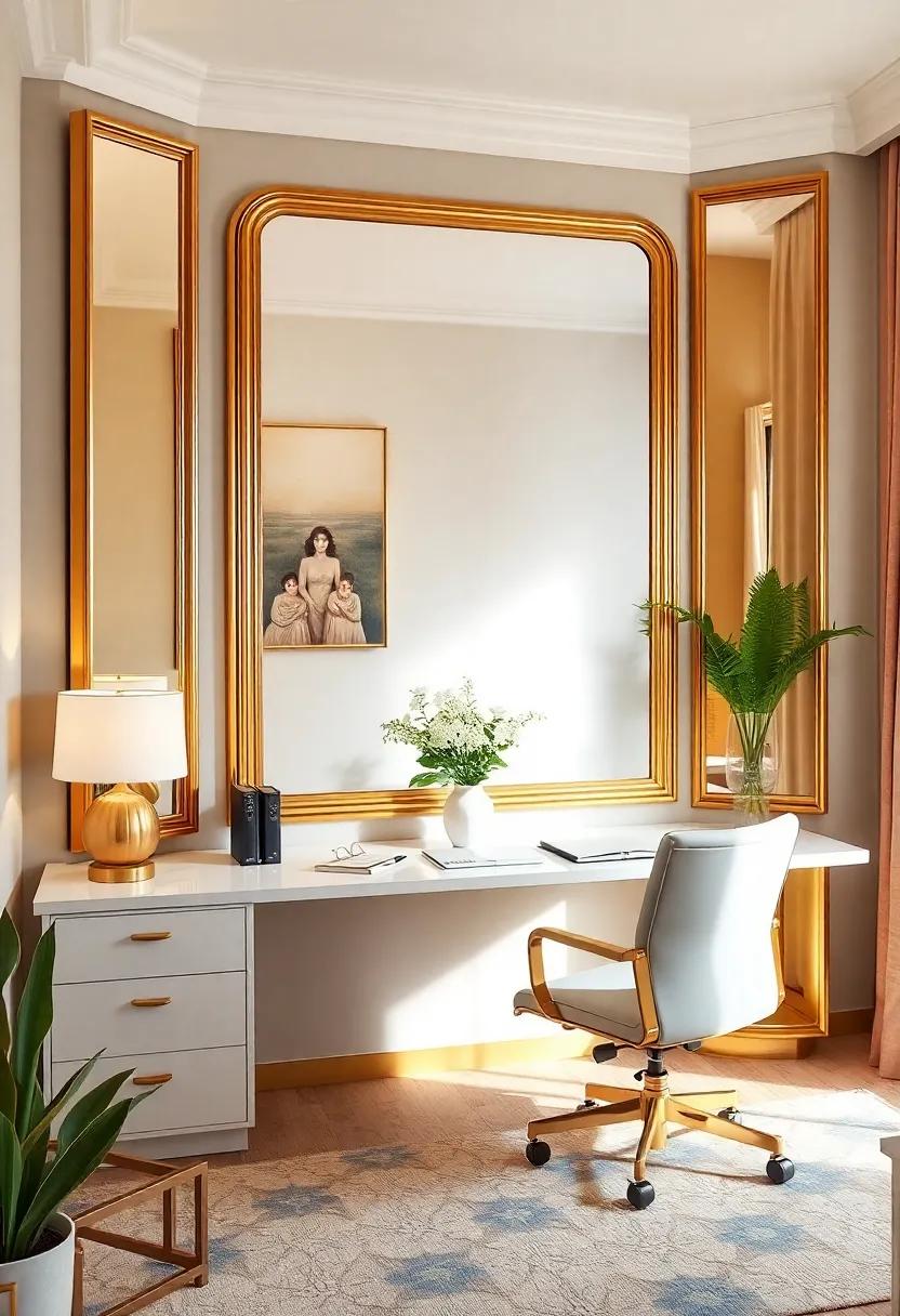 Imagine stepping into a workspace where the atmosphere is transformed by the enchanting play of light. Oversized gold-framed mirrors not only reflect your creativity but also imbue the room with a luxurious feel. These stunning accents create an illusion of space, inviting you to see not just what is in front of you but the limitless possibilities that lie beyond. Each glance into the mirror can ignite motivation, urging you to tap into your artistic potential as the shimmering surfaces bounce natural light throughout the room, creating a warm and inviting glow.