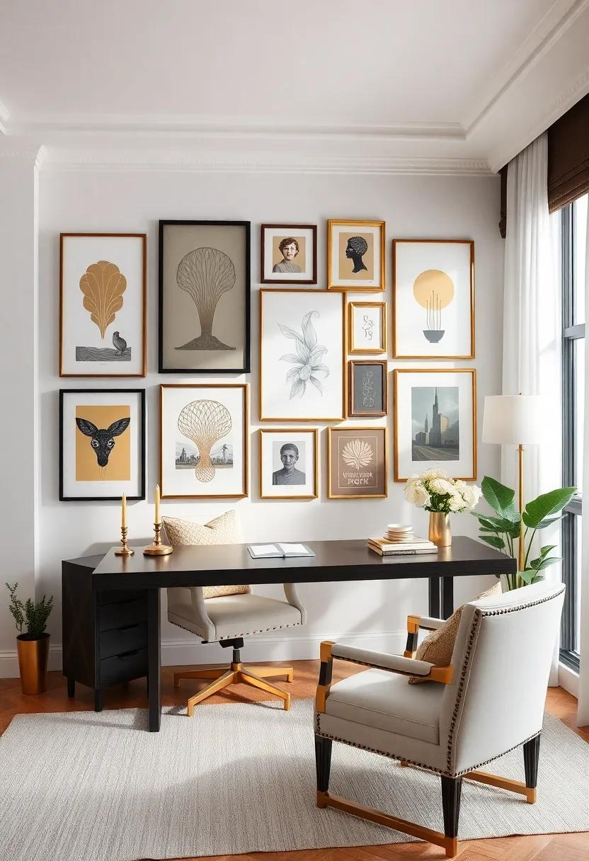 Get captivated by a luxurious home office featuring an inspiring gallery wall filled with Art Deco prints and framed gold accents, seamlessly blending inspiration with elegance
