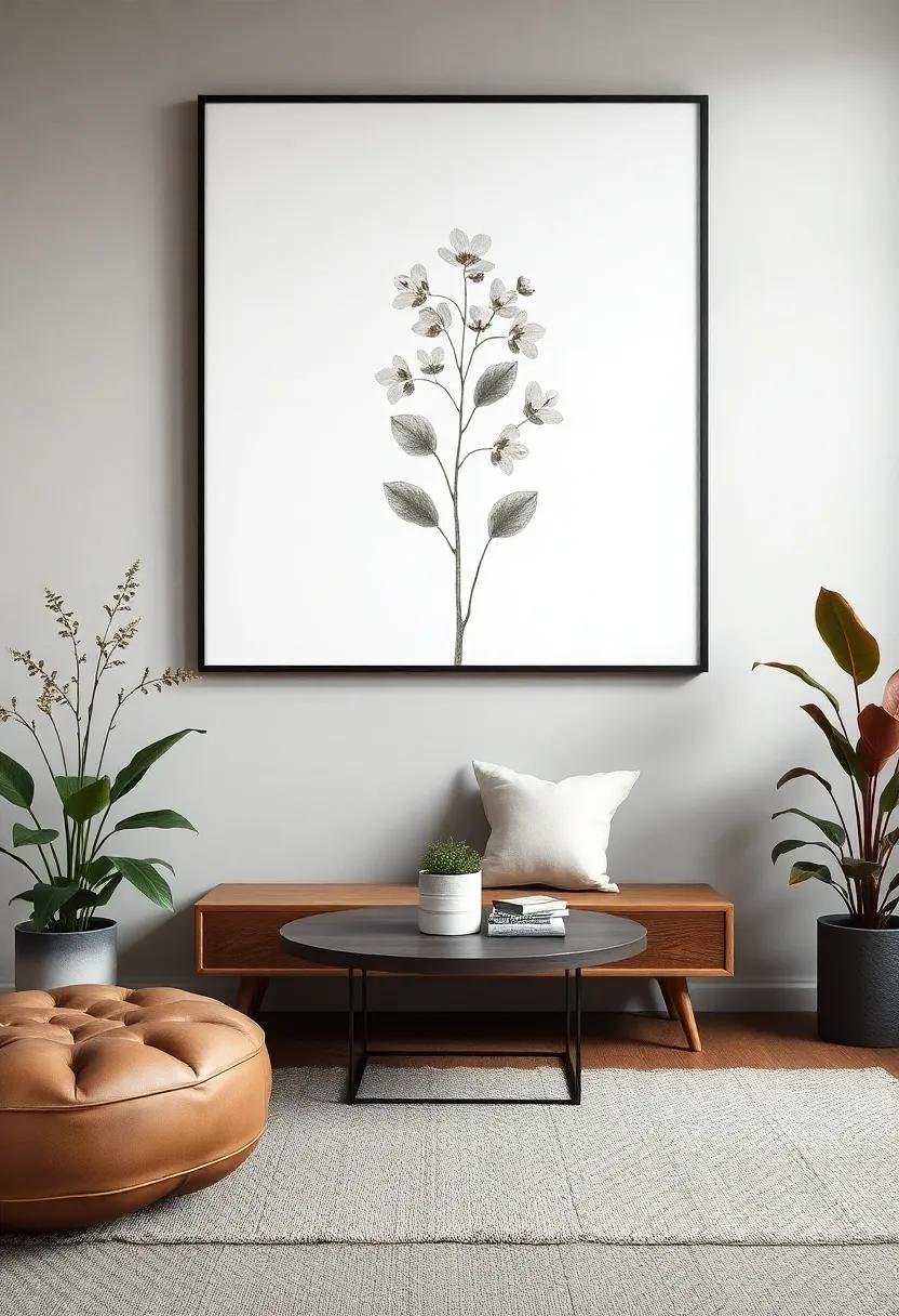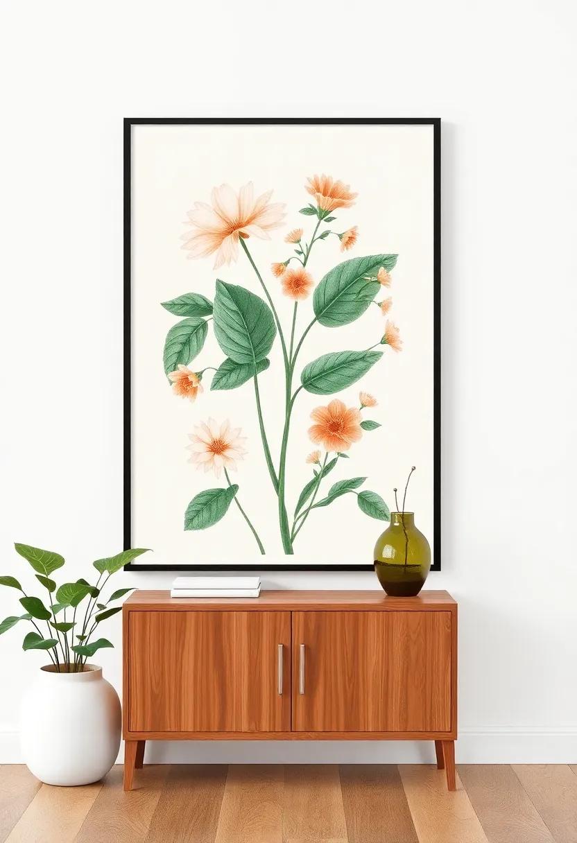When choosing your botanical prints, you might opt for a mix of large-scale scans that serve as statement pieces alongside smaller, clustered prints for a gallery wall. This layered approach allows for an engaging visual dialogue within the space, drawing the eye without overwhelming.Select frames that complement the prints—think simple, natural woods or elegant gold finishes to enhance that grandmillennial aesthetic. Below is a quick reference for incorporating various plant types: