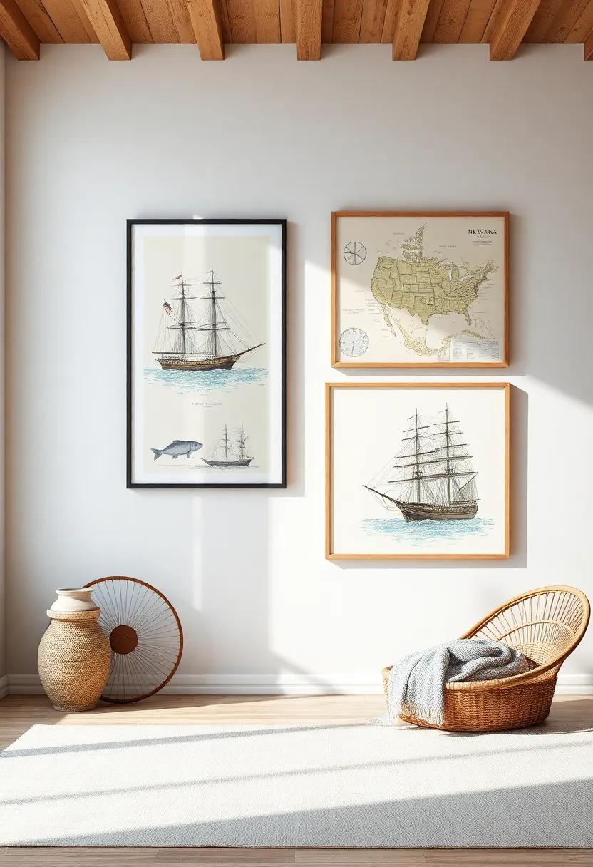 Nautical Prints: Bring the charm of the sea indoors with vintage nautical art, featuring ships, maps, and marine life to create a serene coastal vibe