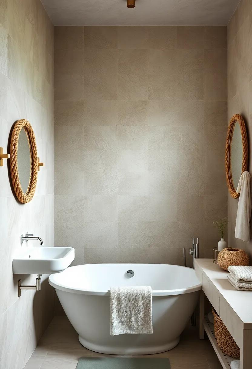 Consider incorporating rope in unexpected places, like creating a striking mirror frame. Utilize thick nautical rope to encircle an existing mirror, lending a beachy vibe that reflects your coastal theme. You can craft these frames easily by attaching rope to the mirror edges with glue or small nails, ensuring a snug fit. To add depth and texture, try layering different thicknesses of rope or mixing in some shells and driftwood. The result is a stunning focal point that not only enhances your bathroom’s aesthetic but also evokes the calming essence of ocean waves.