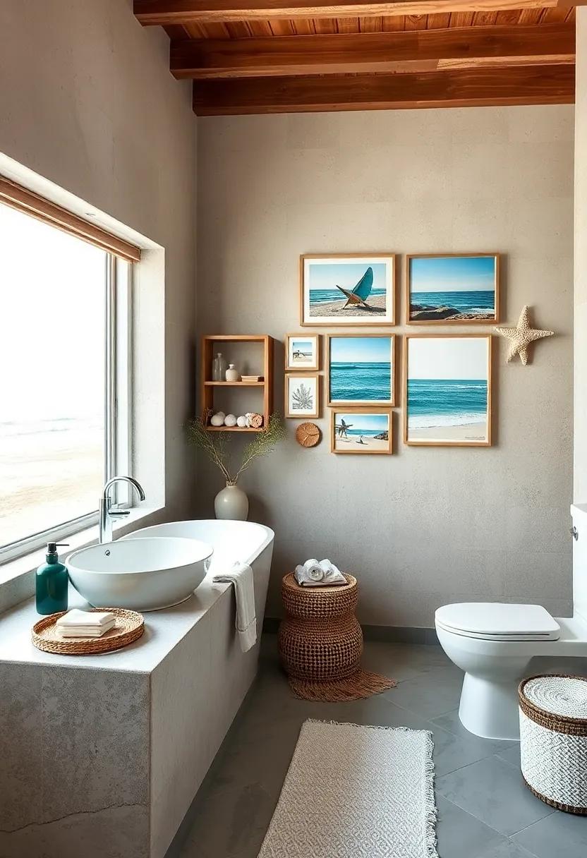 Transform your bathroom into a serene coastal retreat by curating a stunning gallery wall that captures your passion for the ocean. Start by selecting a collection of beach photographs, ranging from sweeping seascapes to intimate close-ups of seashells and driftwood.These images can evoke the calming essence of beach days and create a tranquil atmosphere in your space. To add more character, incorporate coastal art such as watercolor paintings of marine life or vintage prints of lighthouses and sailboats. Consider using a mix of different frame styles—rustic wood, sleek metal, or even driftwood-inspired frames—to add visual interest and depth to the arrangement.