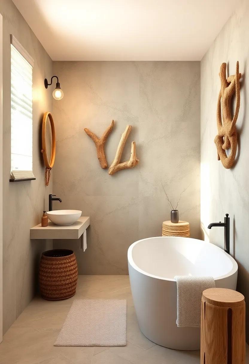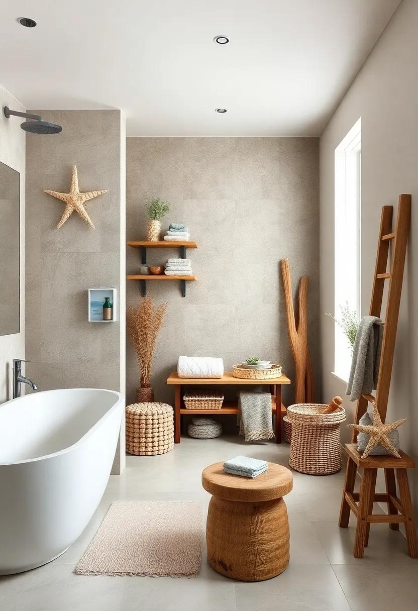 along with art, driftwood can easily double as functional decor. Consider crafting a rustic towel rack by mounting a sturdy piece horizontally near your sink or shower area. Not only does this add a touch of beachy charm, but it also keeps your towels within easy reach. To create an inviting look, match the driftwood with natural fiber baskets or seashell accents. Don’t forget, adding elements like rope or marine-themed accessories can tie the whole aesthetic together, making your bathroom feel like a private coastal retreat.