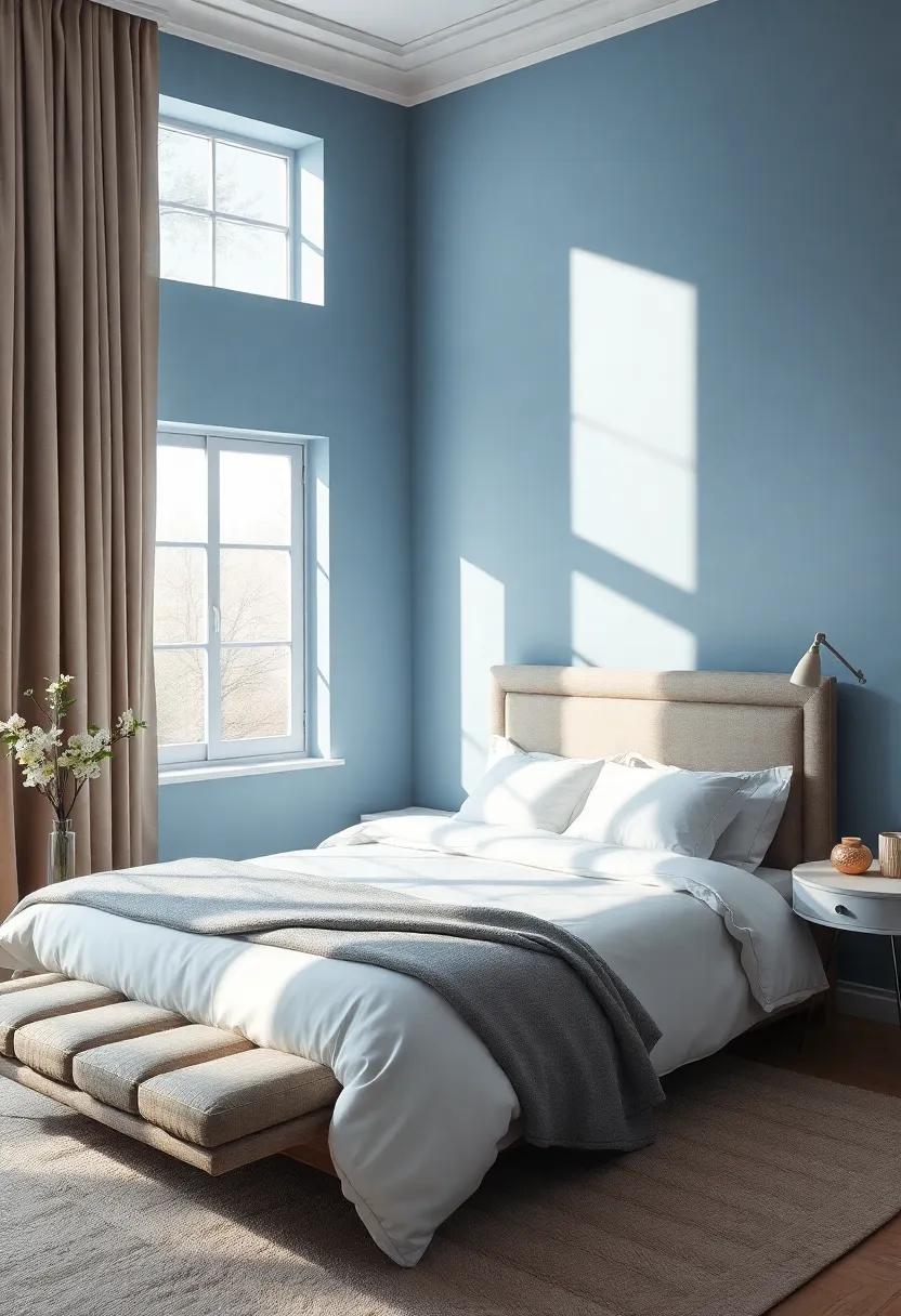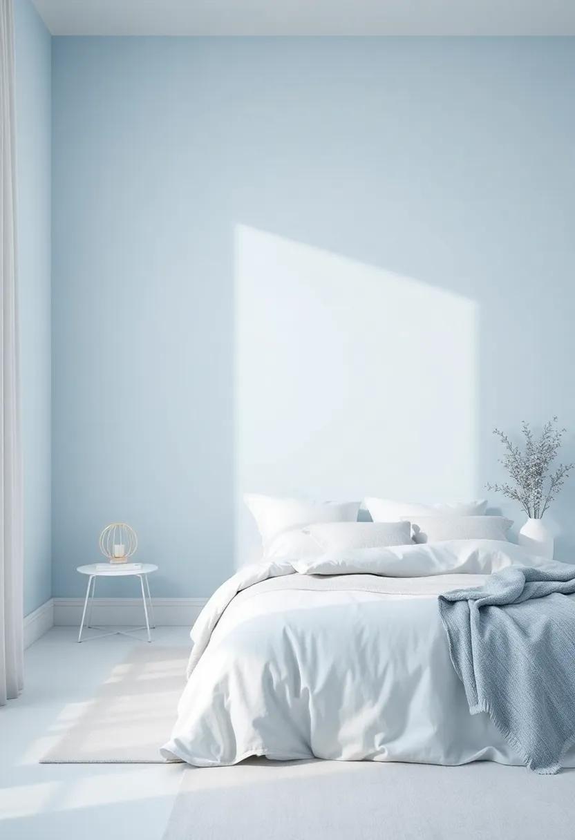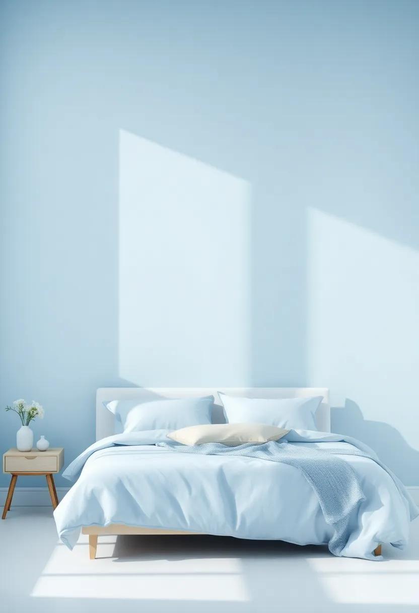When decorating with Sky Blue, consider incorporating varying tones to create depth and interest within your bedroom. Use lighter shades on the walls and complement them with deeper blue throw pillows and cozy blankets.You can also introduce texture through materials like linen or cotton, which resonate beautifully with the color palette.For accents, think about silver or glass decor pieces that glint like sunlight reflecting on water, adding a touch of elegance while maintaining that peaceful vibe. Here’s a simple table to help you visualize the ideal pairings: