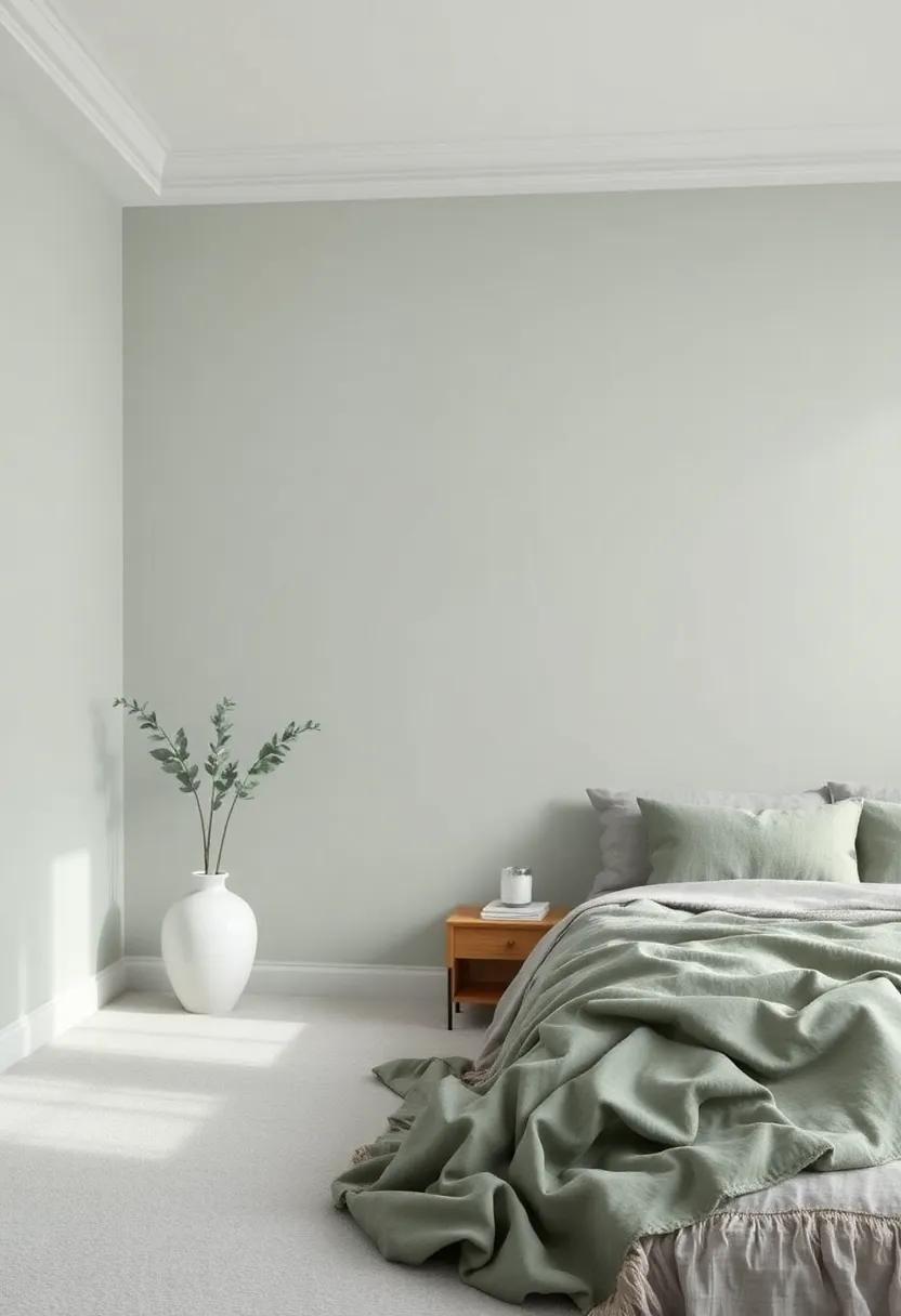 pairing misty gray-green with warmer hues or deeper shades like navy can create striking contrasts, bringing depth to your sanctuary. While a minimalist approach fosters a clean space for relaxation, layering textures—from soft cottons to rich velvets—will introduce warmth, turning your room into a cozy retreat that feels as refreshing as a walk in the foggy woods.
