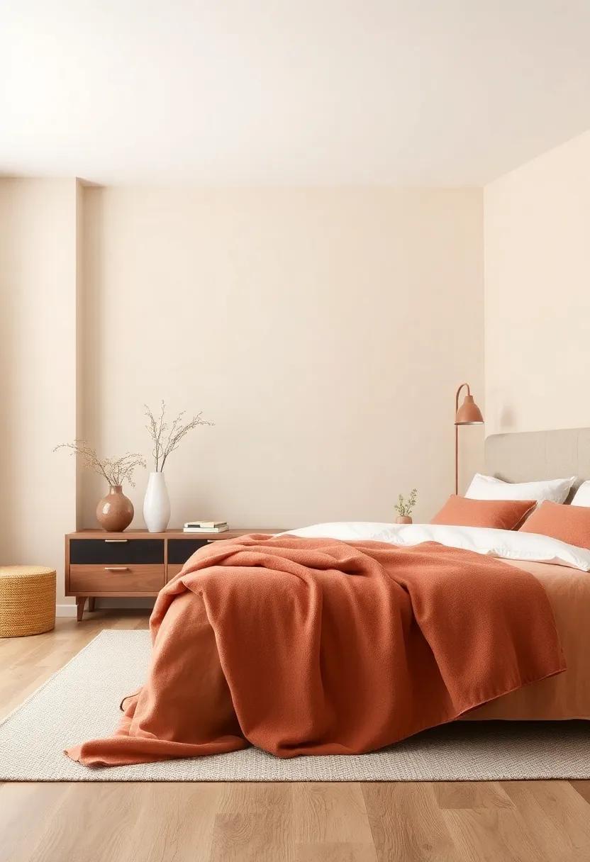 This delicate balance transforms your bedroom into a sanctuary where every shade invites comfort and peace. With warm stone as your foundational color, you’ll create a harmonious haven that promotes restful sleep and rejuvenation.