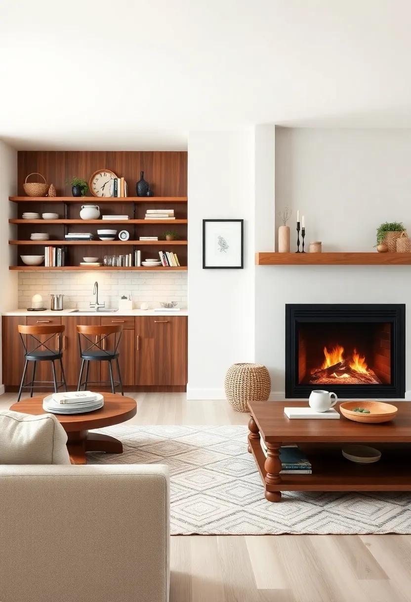 To enhance the warmth of the space, playing with lighting is essential. Install recessed lights above each shelf or use LED strip lights to highlight your favorite décor. Incorporating a mix of open and closed shelving allows you to conceal less attractive items while still showcasing your treasured possessions. For an added touch of personalization, customize the bracket colors or add decorative back panels to the shelves, creating an inviting atmosphere that enhances the overall aesthetic of your living room-kitchen area.