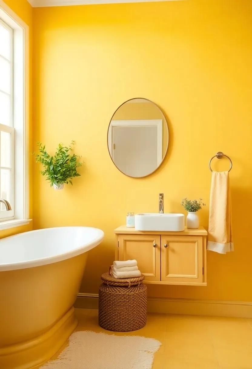 To complement this cozy color, consider integrating textiles and decor that highlight the organic vibe. Elements like woven baskets, cotton towels, and artisan pottery work beautifully with the sandy yellow backdrop, adding tactile interest to the room. Pairing it with muted greens or deep terracotta can create a stunning palette that celebrates the beauty of the outdoors. Here’s a quick reference on how to bring this shade to life in your bathroom design: