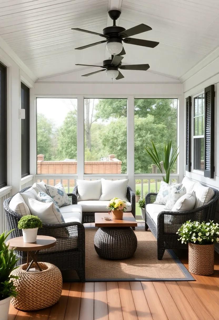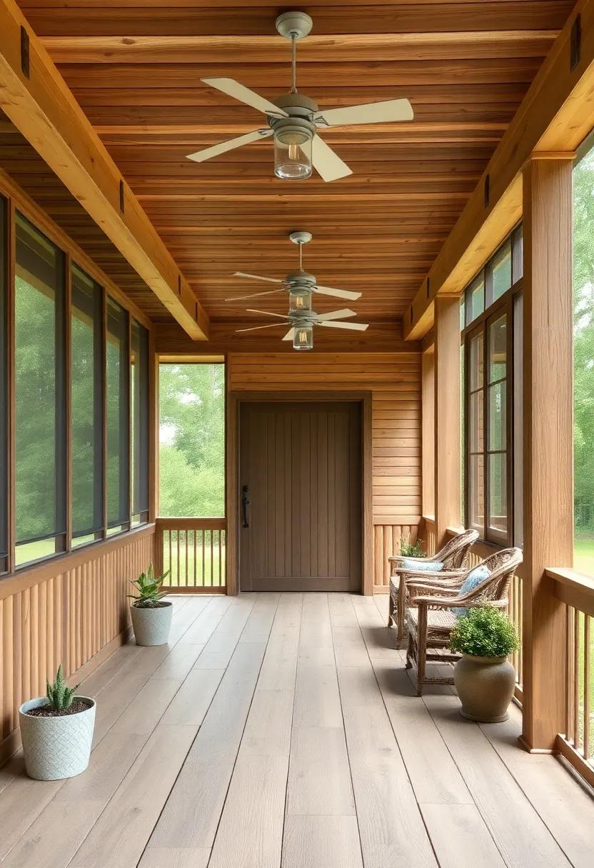 Farmhouse-Style Ceiling Fans: Install paddle fans with a rustic finish to keep your screened porch cool while enhancing the farmhouse vibe