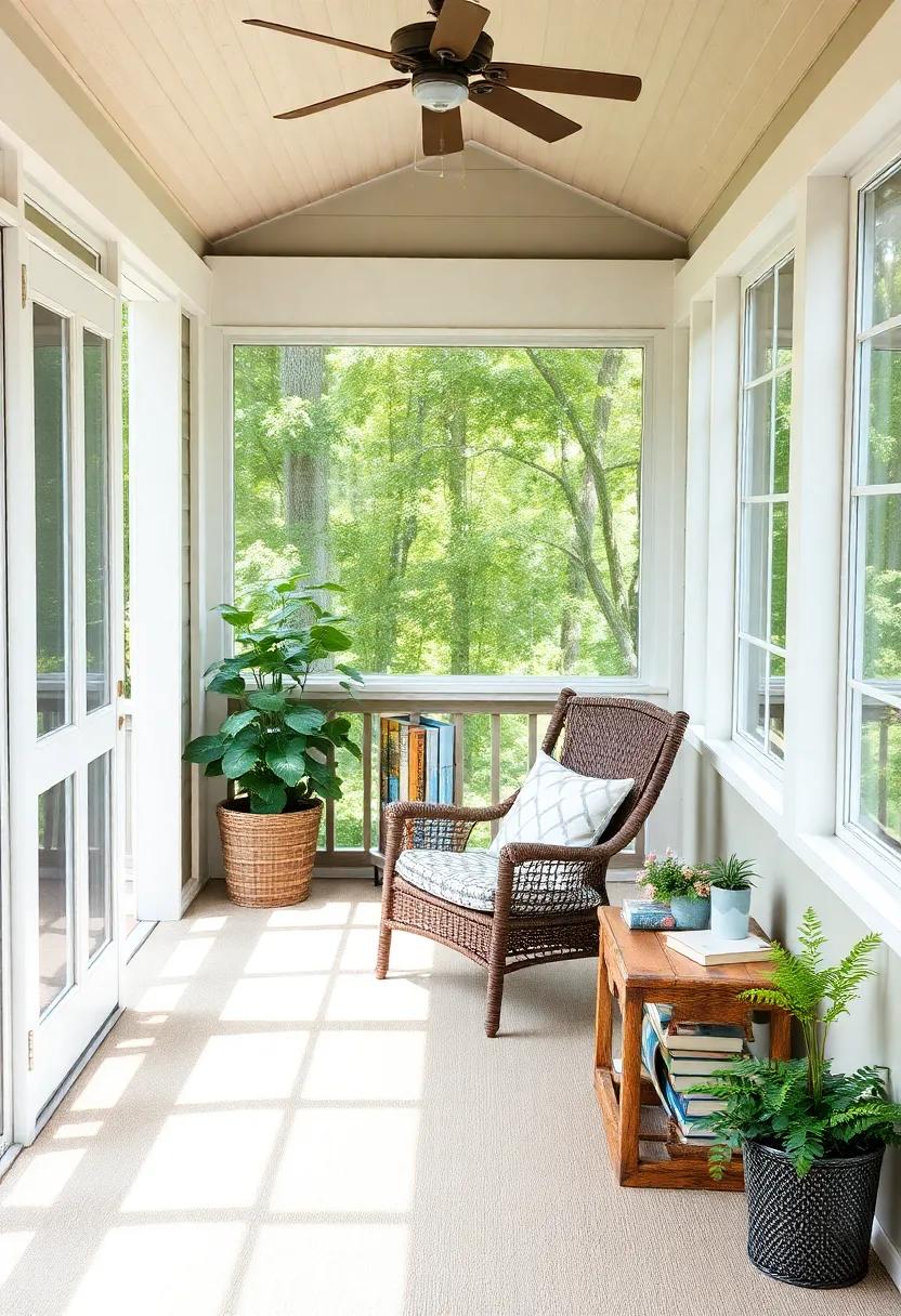 Transform a secluded corner of your screened porch into a blissful reading sanctuary by incorporating elements that invite both comfort and imagination. Start with a plush armchair where you can sink in and lose track of time. Surround this chair with soft throw blankets and decorative pillows to create a warm atmosphere. Good lighting is essential; consider a stylish floor lamp or string lights to cast a soft glow during twilight. Position a small side table within reach for your favorite beverage or a small vase of fresh flowers, bringing a touch of nature indoors.