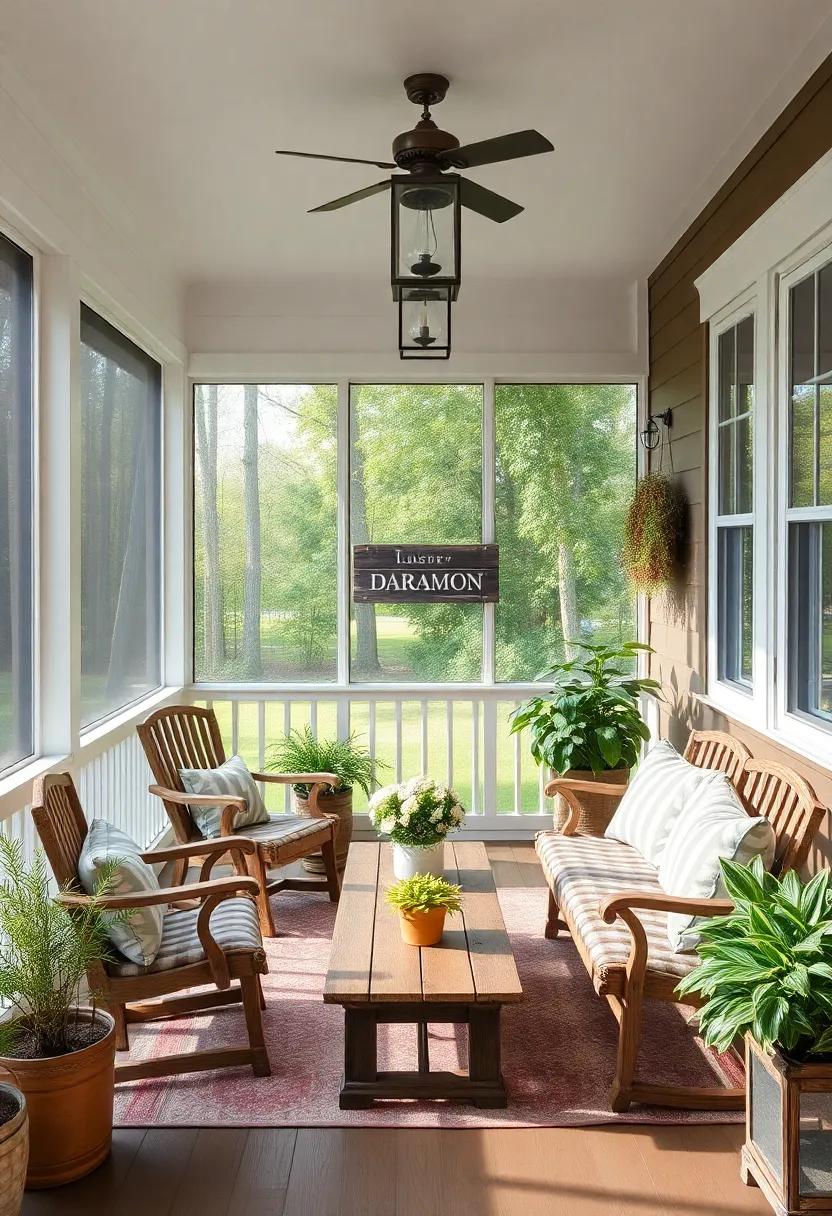 transform your screened-in porch into an inviting escape by incorporating a fire pit that acts as the focal point for gatherings. Imagine the glow of flickering flames casting a warm light as friends and family come together on crisp evenings. To enhance this cozy atmosphere, surround your fire pit with plush seating options like oversized cushions and rustic wooden chairs. Choose colors and patterns that reflect the farmhouse aesthetic, such as rich earth tones or soft, weathered fabrics that feel at home in nature. A low coffee table can serve as a perfect spot for refreshments, and decorative lanterns can add to the ambiance, providing just the right amount of illumination.