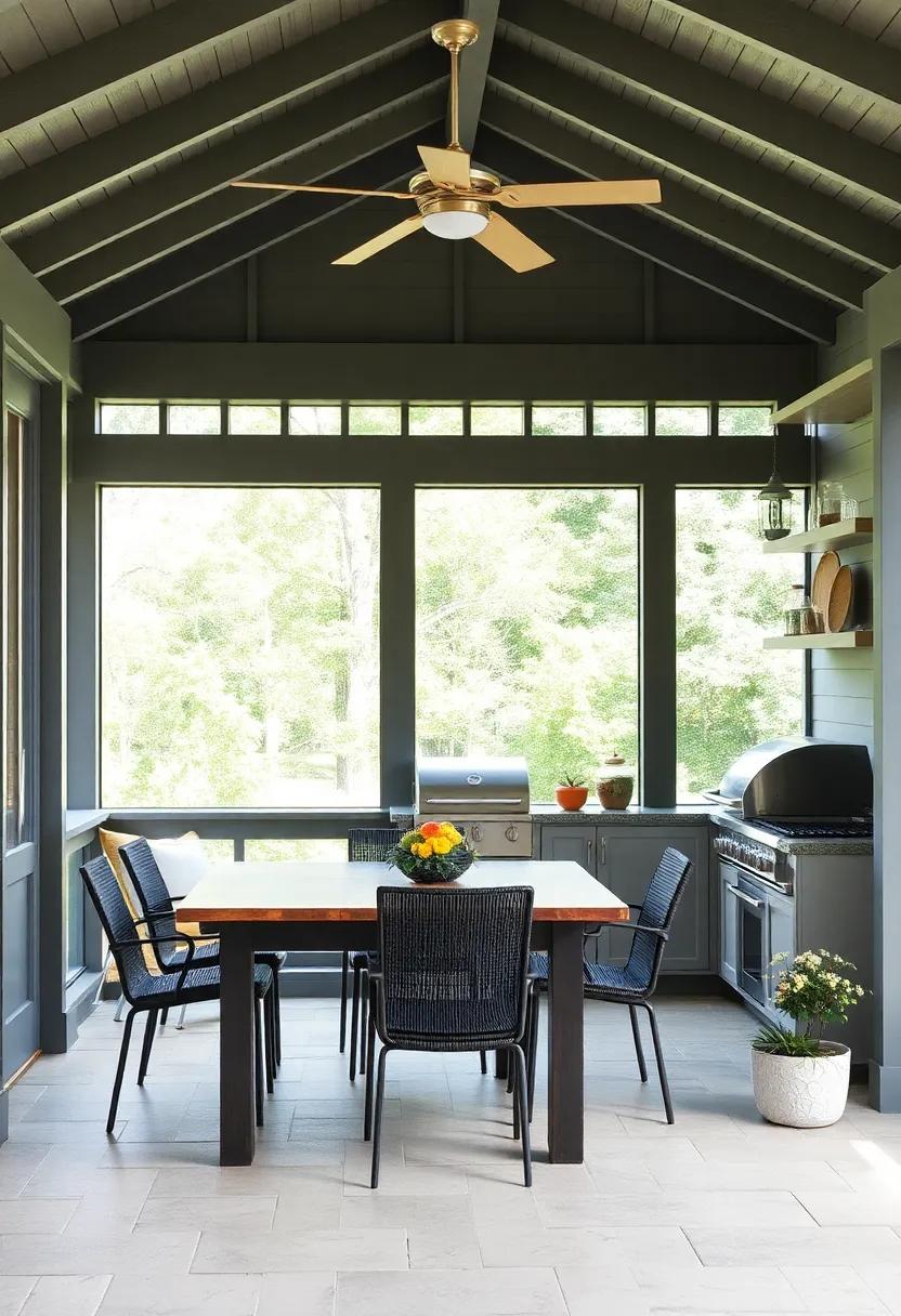Transform your outdoor space into a culinary haven by incorporating a small bar or grill area that boasts farmhouse-style cabinets and open shelving. This functional design not only enhances the rustic charm of your screened porch but also makes cooking and entertaining a breeze. Choose weather-resistant materials that maintain the farmhouse aesthetic while ensuring durability. Distressed wood or shabby chic finishes for the cabinets can perfectly complement the overall design, offering an inviting atmosphere that encourages social gatherings.