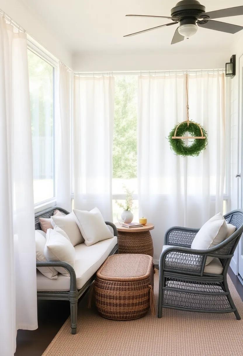 To create an inviting retreat on your screened porch, opt for curtains and pillows that marry softness with a touch of natural elegance.Linen and cotton are fantastic choices; their breathable properties provide comfort while maintaining a cozy atmosphere. Choose soft, neutral colors like beige, sage green, or muted gray. These shades not only complement the farmhouse aesthetic beautifully but also enhance the natural light filtering through your windows, giving the space a bright and airy feel. Layering different textures, like adding a knitted throw or a textured cushion, creates depth and invites relaxation.