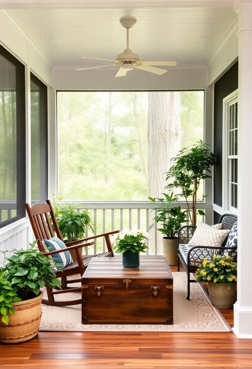 Embracing the charm of yesteryears can transform your screened porch into a cozy retreat that tells a story. Imagine a beautifully weathered wooden rocking chair, its paint softly peeling, bringing a sense of tranquility as you sway back and forth, sipping your morning coffee. Pair it with vintage accents like throw pillows embroidered with floral patterns to add pops of color, creating a delightful contrast against the rustic piece. For functionality and style, consider placing an old trunk nearby, where you can stash extra blankets or your favorite outdoor reads. It not only serves as a functional storage solution but also acts as a stunning conversation starter, inviting guests to reminisce about the good old days.