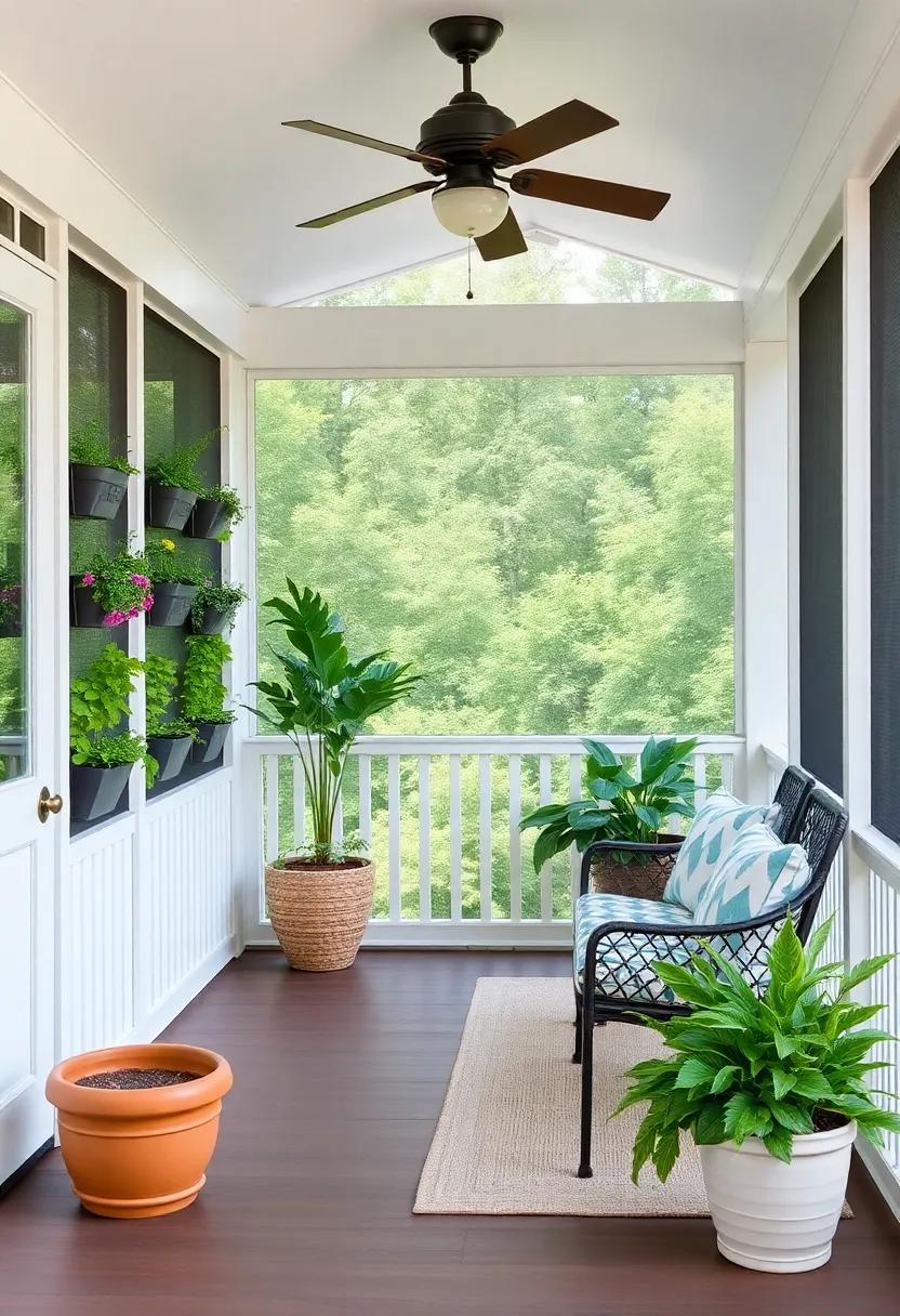 Utilize porches for Vertical Gardens: Create vertical planters with herbs or flowers along the screened walls to maximize space while adding vibrancy
