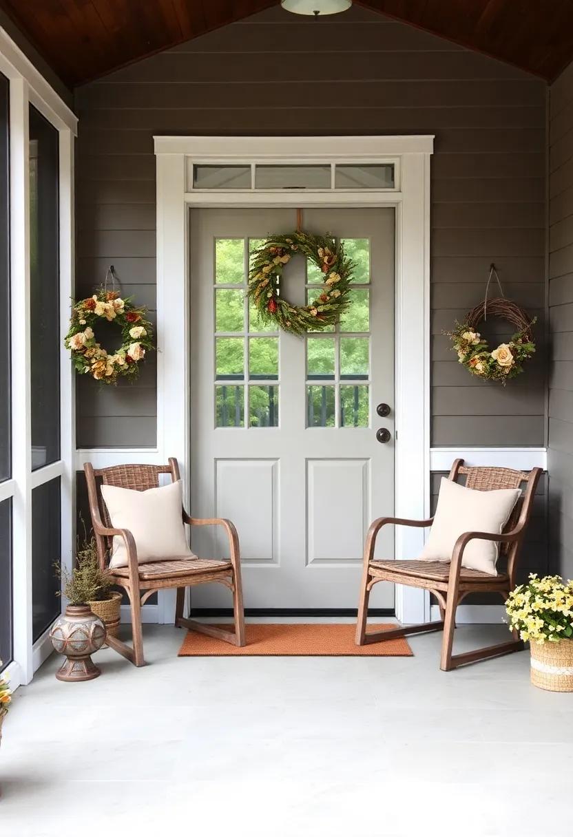 Creating a floating charm, these unique wreaths can enhance not just your door but also interior walls and window spaces, drawing in the natural beauty of your surroundings and enhancing the farmhouse charm of your screened porch.