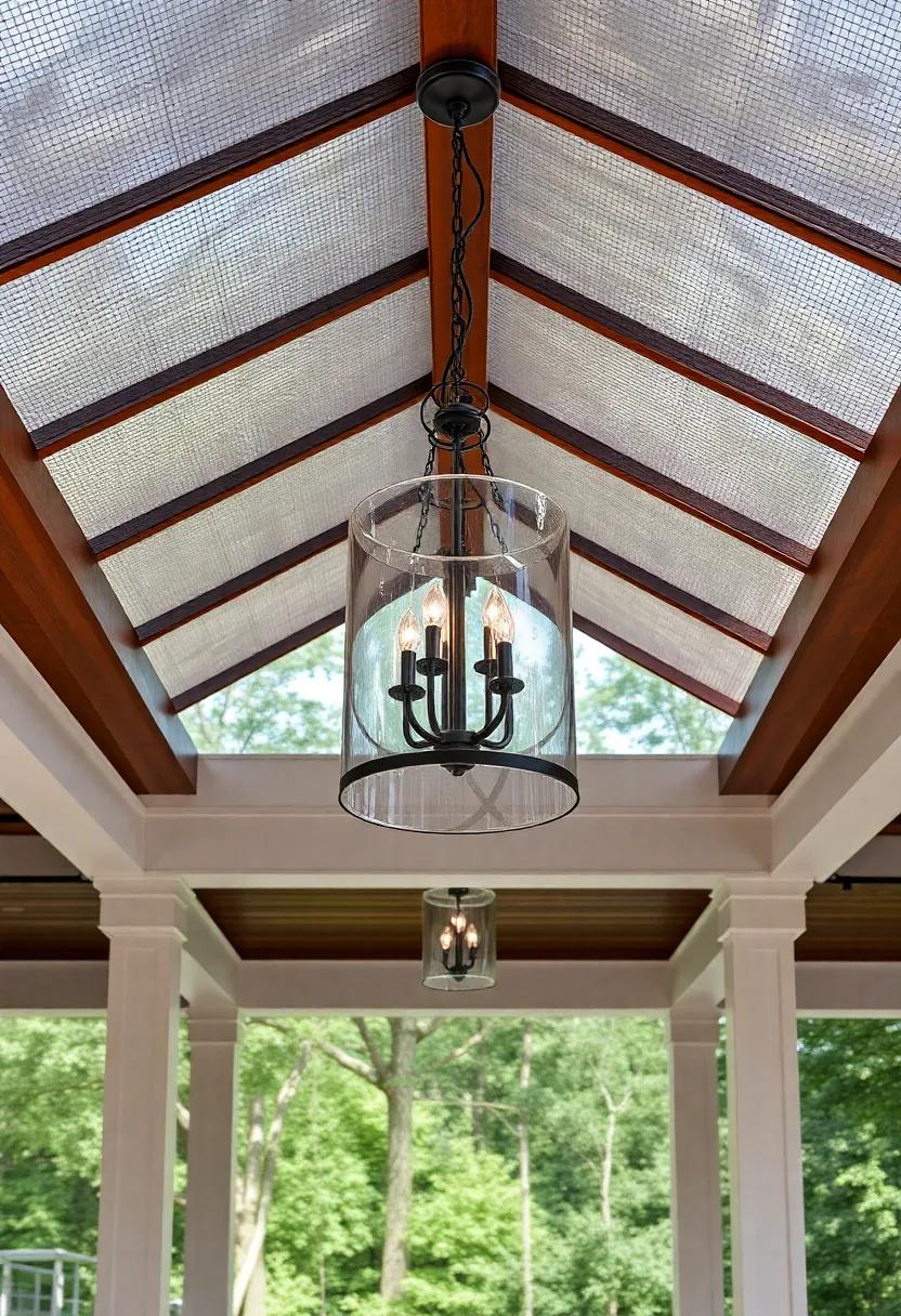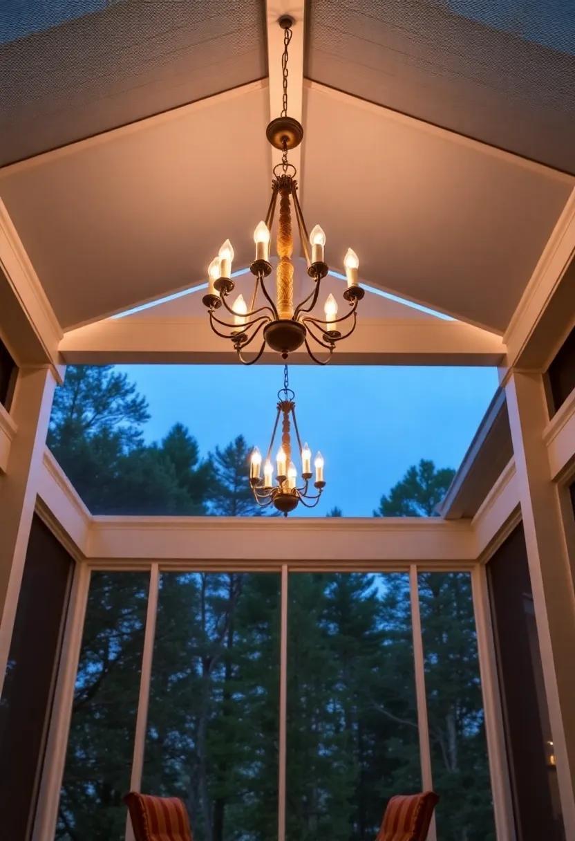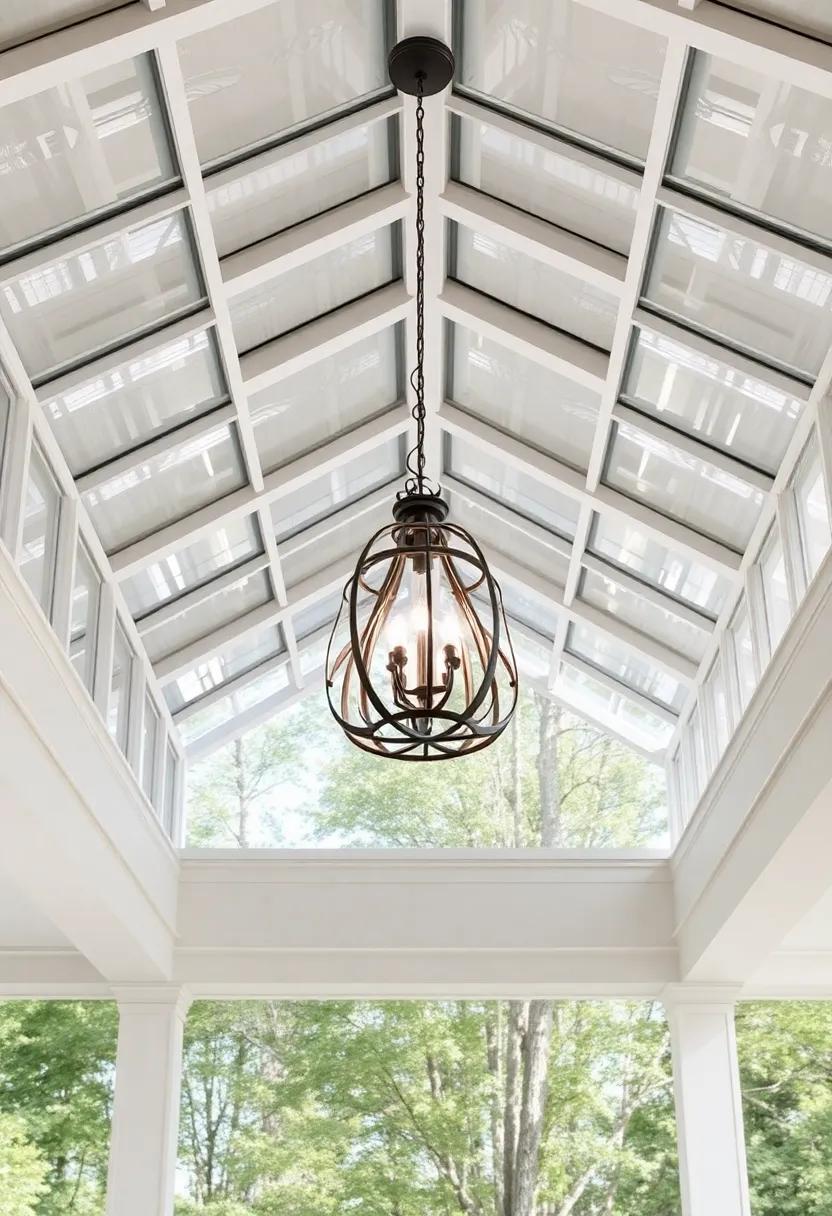 imagine a serene space where the indoors seamlessly meet the beauty of nature outside. A ceiling adorned with glass panels not only invites an abundance of natural light but also offers a panoramic view of the surrounding landscape. To enhance this experience, a chic, modern chandelier can become the focal point of the room, casting a warm glow that complements the daylight streaming in. This clever combination encourages tranquility, making your screened porch an inviting retreat for relaxation or social gatherings.