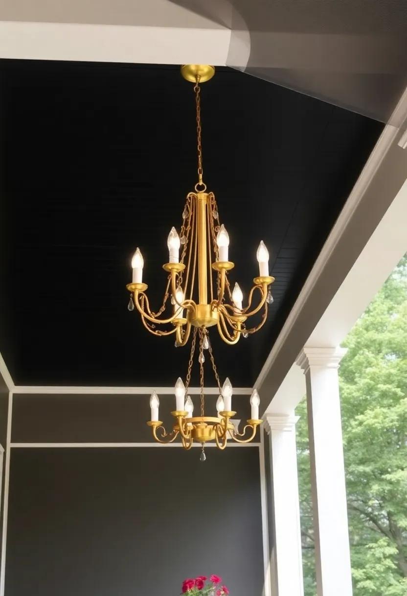 Go bold with a dramatic black ceiling, pairing it with a stunning gold chandelier that commands attention and elevates outdoor dining