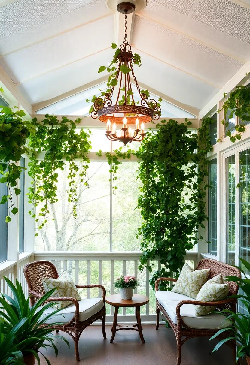 Transform your screened porch into a verdant retreat by incorporating a living ceiling adorned with climbing vines. This unique design element not only enhances the ambiance but brings a refreshing splash of nature indoors. Imagine the soft rustle of leaves and the subtle fragrance of greenery suspended above you, creating a serene space that feels connected to the grate outdoors. Harmonizing with this natural feature, consider a nature-inspired chandelier that mimics organic forms and materials.Crafted from materials like reclaimed wood or delicate wrought iron, these fixtures can serve as an eye-catching centerpiece while providing warm, ambient lighting that softly illuminates the natural beauty surrounding you.