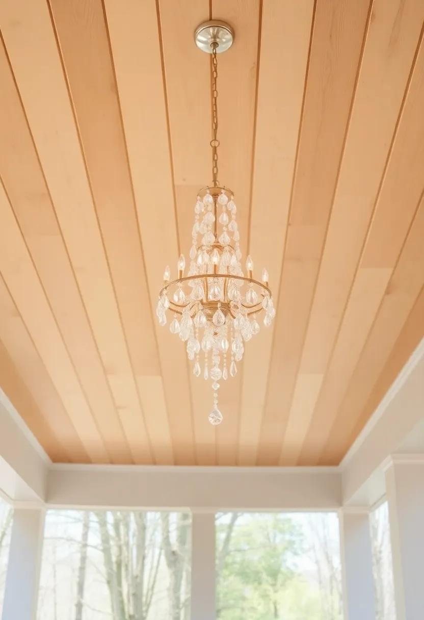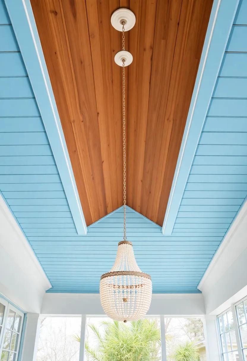 Transform your screened porch into a tranquil retreat reminiscent of coastal charm with bright blue wood ceilings. This vibrant hue not only reflects the expansive sky but also embodies the relaxing aura of seaside living.Coupled with a delicate beaded chandelier, the space can radiate warmth and elegance. The chandelier, adorned with intricate beadwork, mirrors shimmering ocean waves, creating a gentle play of light that invites you to unwind. Imagine sipping a cool drink as sunlight dances through the beaded accents, casting mesmerizing patterns on the floor below.