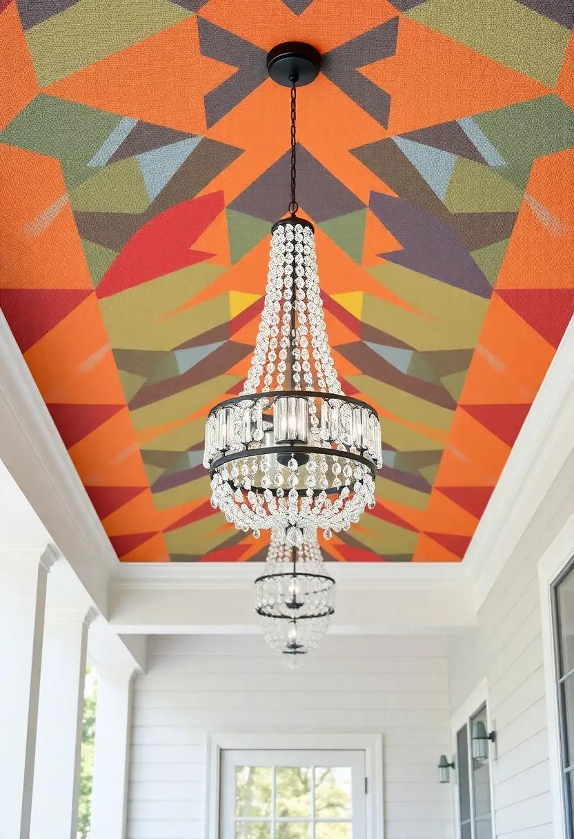 A chic chandelier can serve as the crowning jewel in this bold ceiling design. Choose one that mirrors the colors or geometric shapes of your ceiling to ensure harmony within the space. Here are a few options to consider: