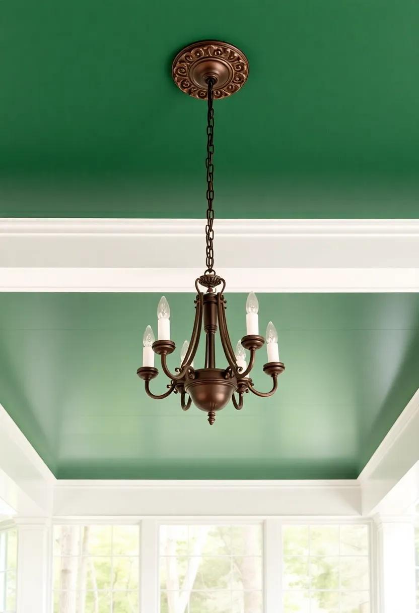 discover the enchanting allure of a painted ceiling in a rich hunter green, paired with an ornate bronze chandelier for a touch of sophistication