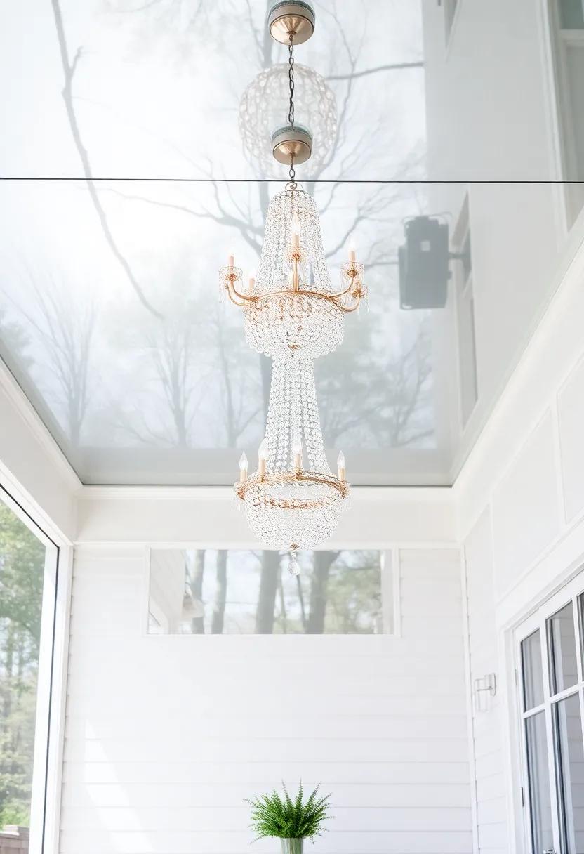 Transform your outdoor retreat into a lavish escape by opting for a mirrored ceiling. This design choice not only amplifies the natural light flooding your screened porch but also creates a mesmerizing effect with reflections of your elegant chandelier. imagine hosting a cozy evening under the sparkling glow, where the light dances off the mirrored surfaces, adding depth and a sense of grandeur to your space. The juxtaposition of nature’s beauty against the shimmering reflections crafts an ambiance that feels both serene and luxurious, making every moment on your porch feel special.