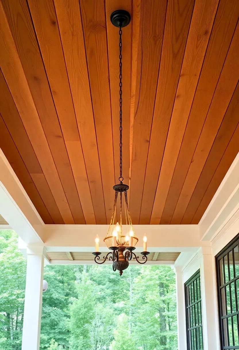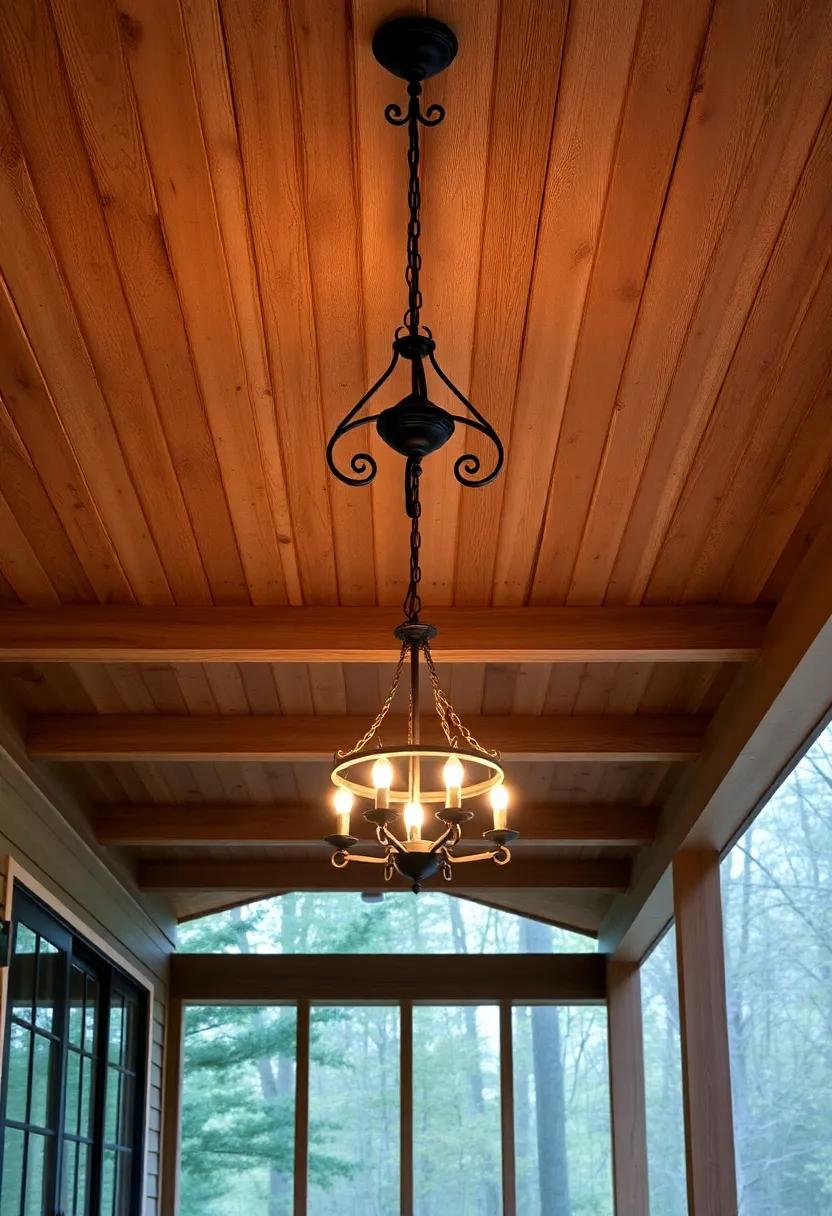 The deep hues of the ceiling serve to enhance your connection with nature, while the chandelier introduces a fine touch of elegance, reflecting a blend of rustic charm and refined taste. This harmonious pairing can easily transform your screened porch into a coveted space, drawing in the outdoors and making you feel enveloped by the majesty of your surroundings. Consider accent pieces like lush indoor plants or stylish outdoor furniture, which can accentuate the elegance of this ceiling design. To further inspire your decor, here are a few must-consider elements that beautifully complement this captivating look: