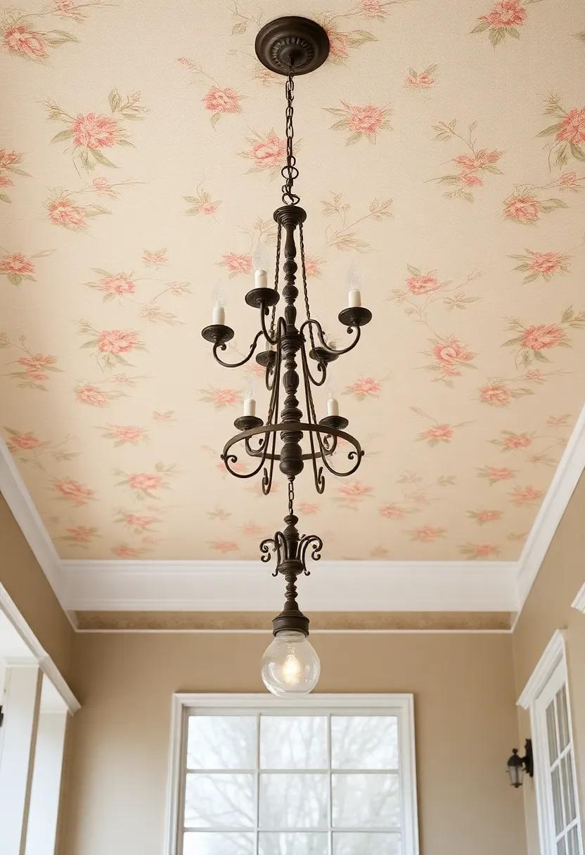 Enjoy the charm of a country-style porch ceiling adorned with floral wallpaper and a vintage chandelier for a touch of nostalgia