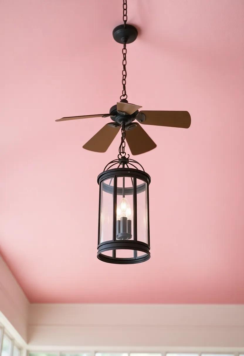 Evoke romance with a soft pink ceiling backdrop, paired with a stunning lantern-style chandelier that creates a magical atmosphere
