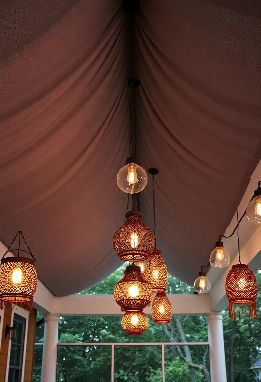 Introduce a bohemian flair with a colorful fabric canopy and an eclectic assortment of hanging pendant lights, perfect for a laid-back retreat
