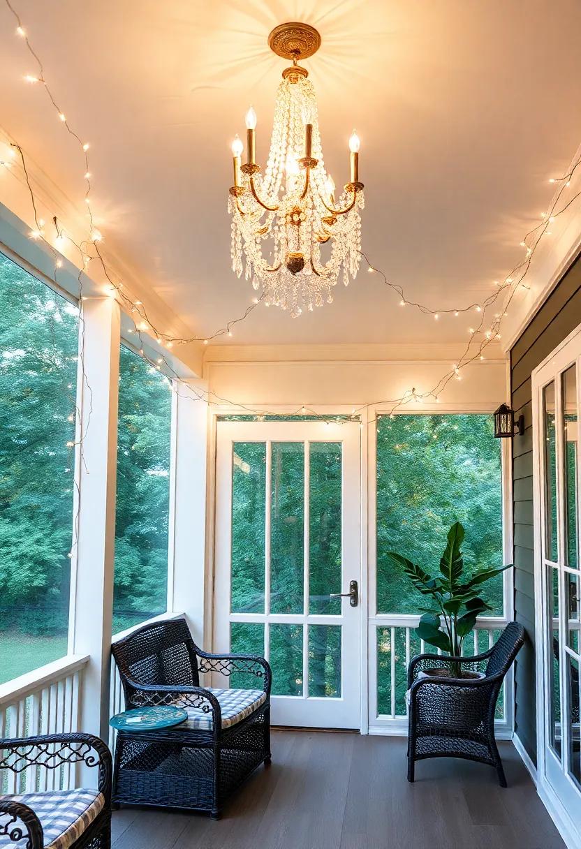 Transform your porch into a fairytale setting with twinkling fairy lights draped elegantly overhead, complemented by a delicate crystal chandelier