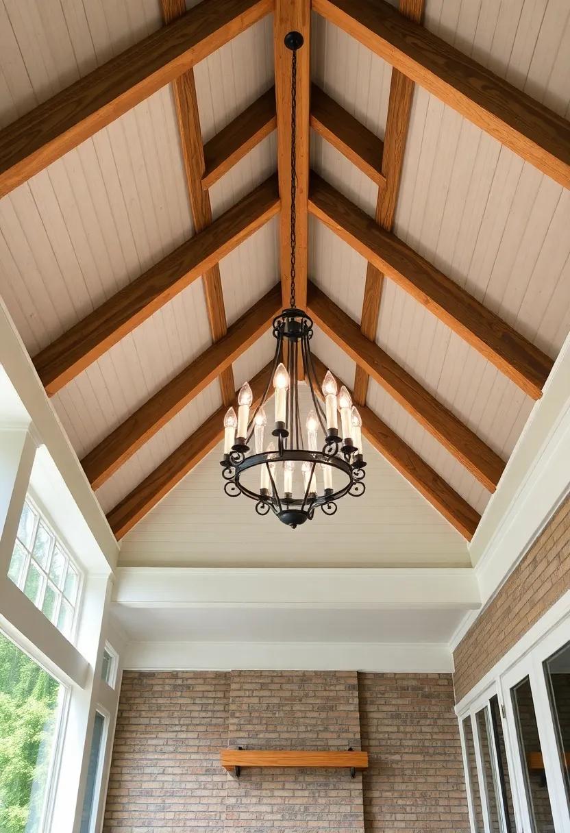 Opt for a vintage farmhouse look with barn wood ceilings,accompanied by a traditional chandelier that adds character and charm