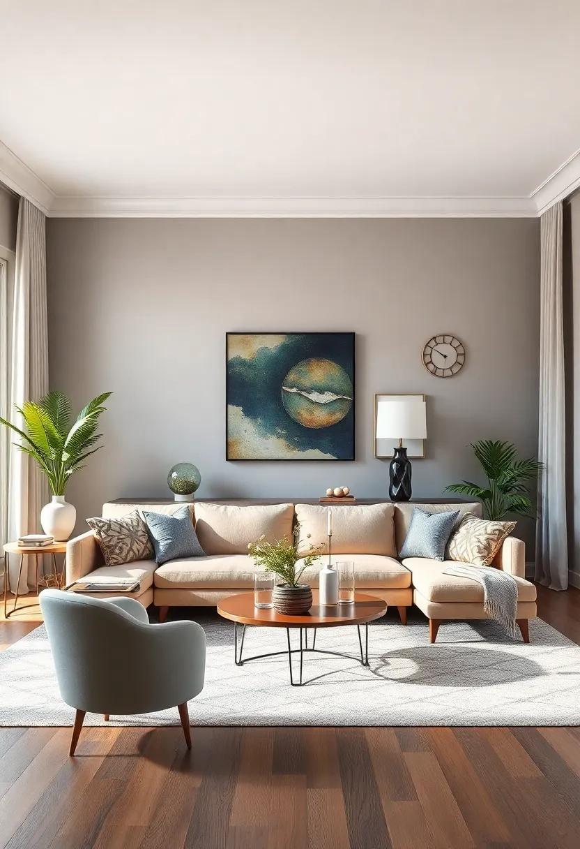 To further enhance this balance, focus on layering texture within your neutral elements. Pair a plush, neutral sofa with a woven jute rug, or mix in metallic accents like a brass lamp or silver photo frames on your shelves. These choices create visual interest without overpowering the quirky items you love. Here are some essential neutral pieces to consider for your living room: