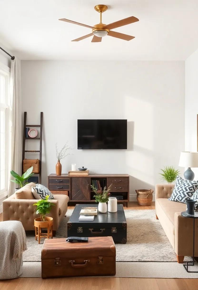 For a more rustic look, consider using wooden ladders as decorative shelving units. Lean a sturdy ladder against a wall and adorn each rung with potted plants, books, or decorative baskets. This not only provides functional storage but also adds vertical interest to your room. To enhance the feature, you might wrap string lights around the ladder for a whimsical glow or paint it in bold colors to make a statement. Embracing the charm of these repurposed pieces ensures your living room reflects a one-of-a-kind personality that is both inviting and imaginative.