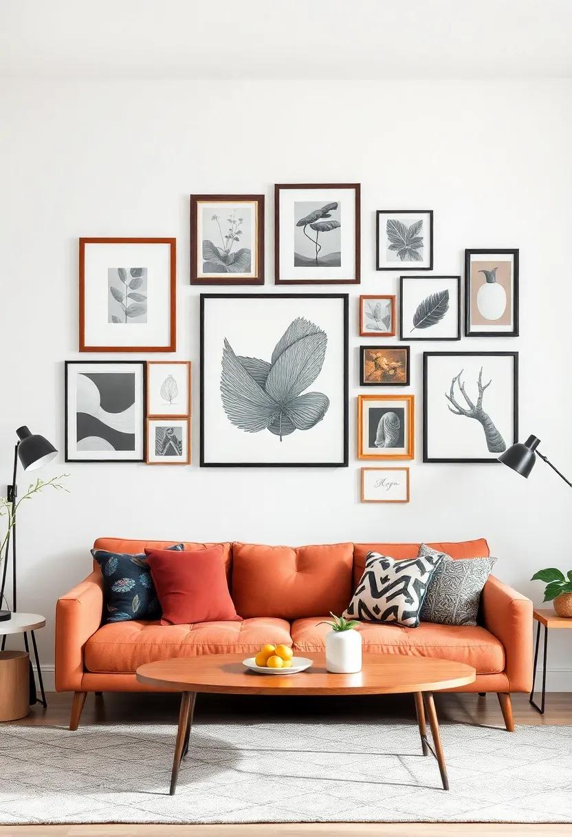 Create a gallery wall by combining different frame styles, sizes, and art pieces for a dynamic focal point