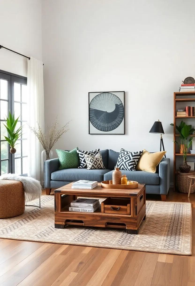 Introduce an unconventional coffee table, like a repurposed door or a stack of vintage crates, to tell a story