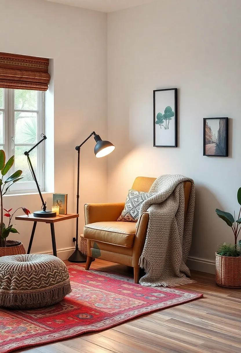 Create a reading nook with a mismatched armchair, a quirky floor lamp, and a soft throw blanket to encourage cozy moments