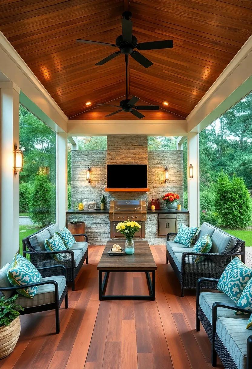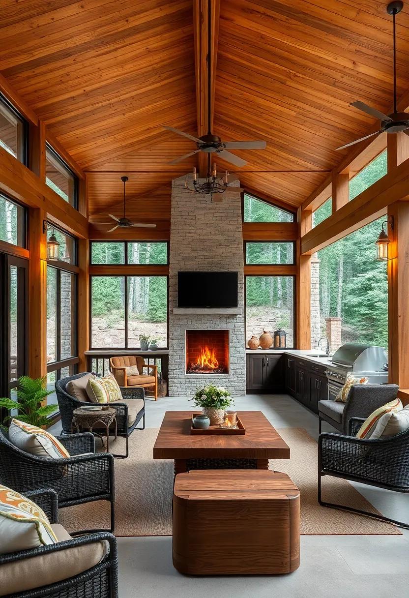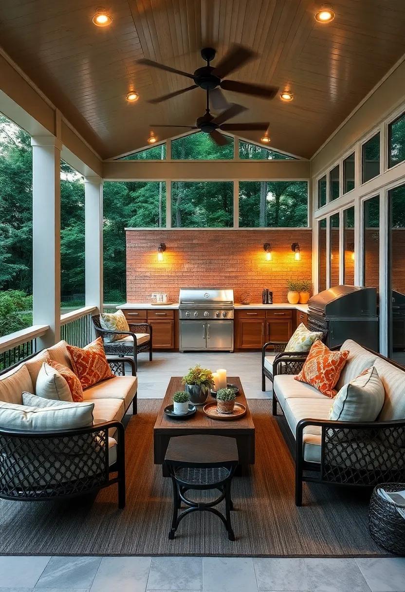 Imagine stepping out onto a screened porch where the natural world meets the comforts of an outdoor kitchen, designed for both culinary flair and cozy gatherings. As the sun sets, you can compose a delightful fusion of flavors, tending to delicious meals while friends and family gather around a flickering fire pit. Warmth emanates from the flames, inviting everyone to relax with cozy blankets or juicy skewers sizzling over hot coals.Adding ambient string lights above can enhance the enchanting atmosphere, transforming your porch into a magical escape where culinary adventures come alive.